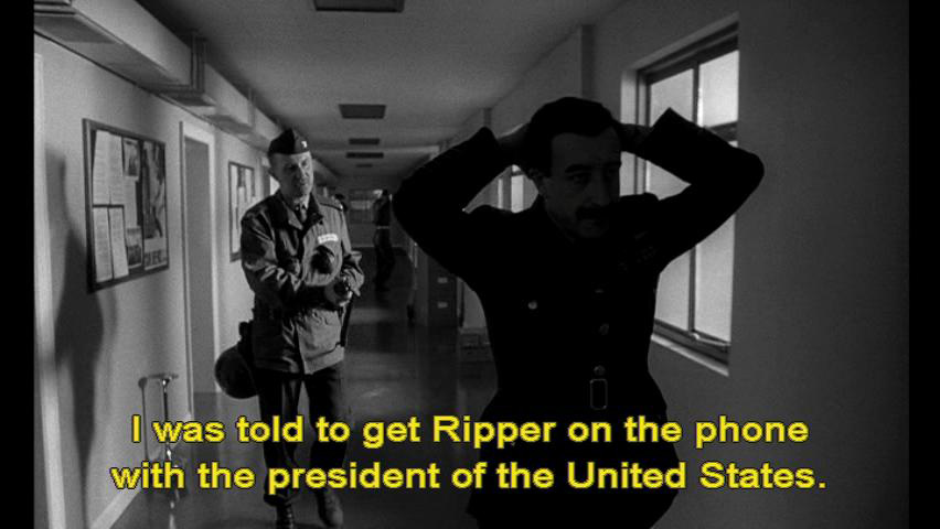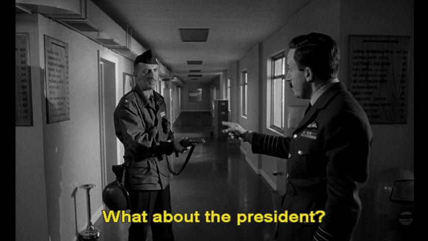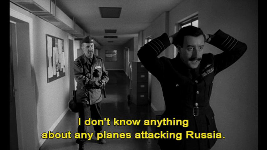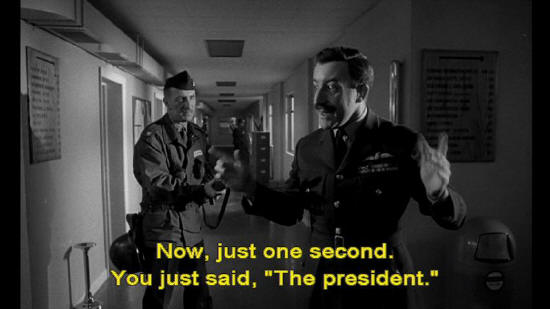 I don't know anything about any planes attacking Russia. I was told to get Ripper on the phone with the President of the United States. Captain Mandrake: Now, just one second. You just said, "The President." Colonel: What about the President?