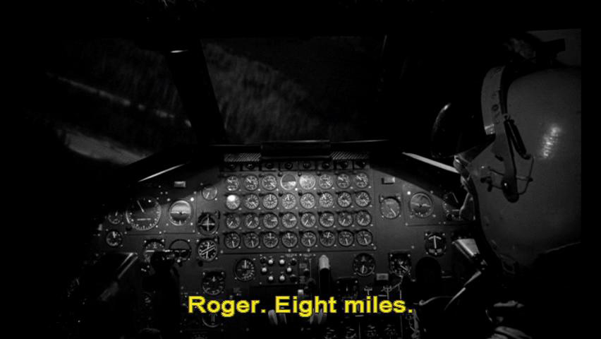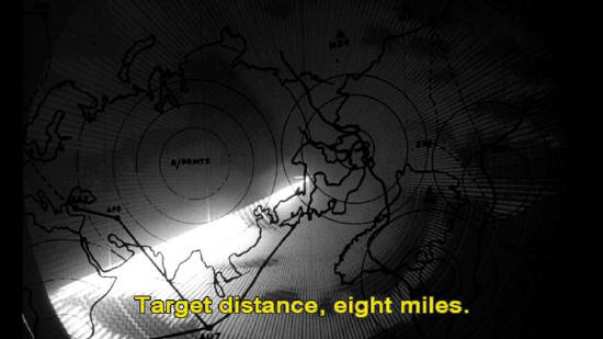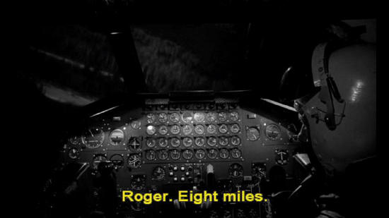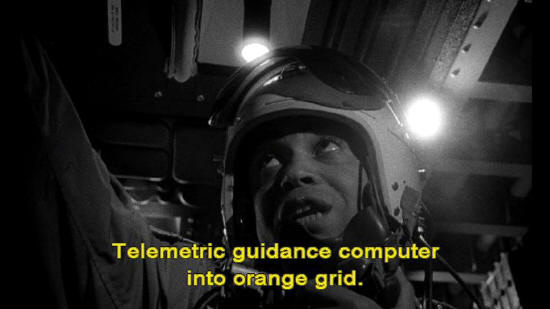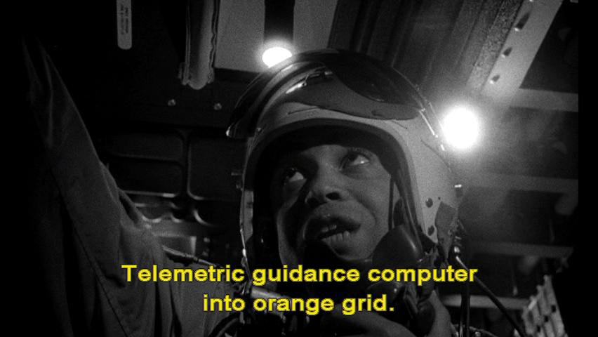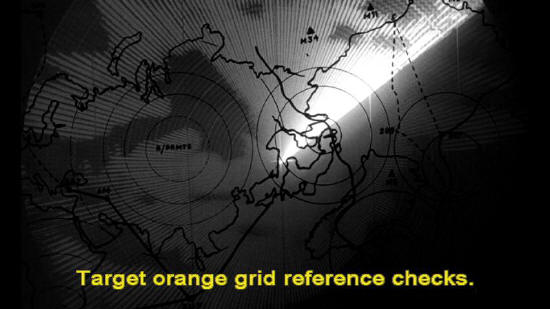 Navigator: Target orange grid reference checks. Target distance, eight miles. Copilot: Roger. Eight miles. Telemetric guidance computer into orange grid. Bombardier: Telemetric guidance computer into orange. grid.