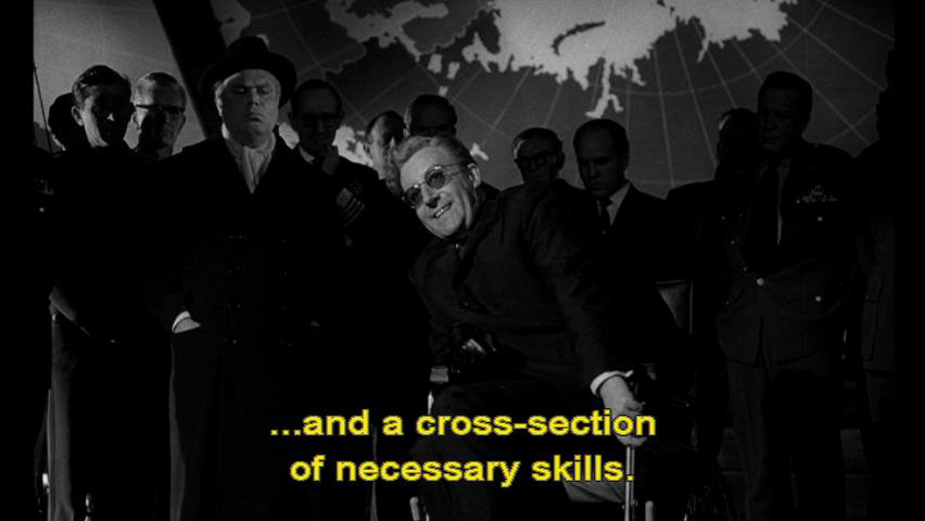 ... sexual fertility, intelligence ... ... and a cross-section of necessary skills. Of course, it would be absolutely vital ... ... that our top government and military men be included ...