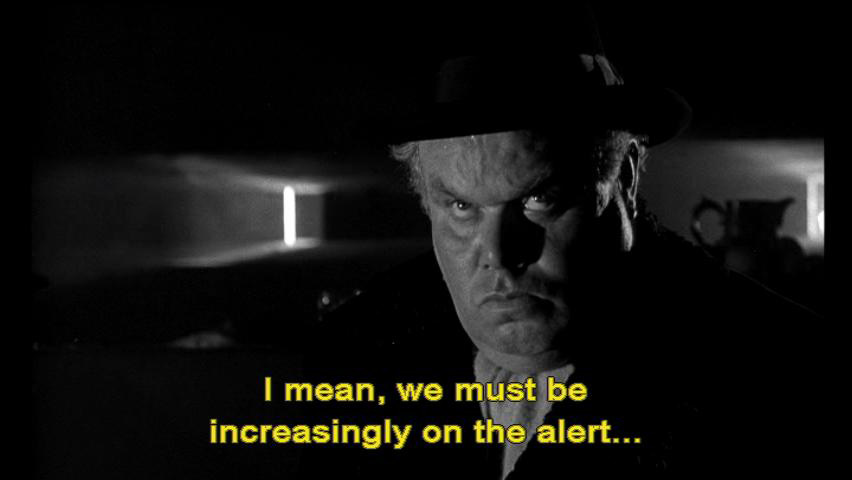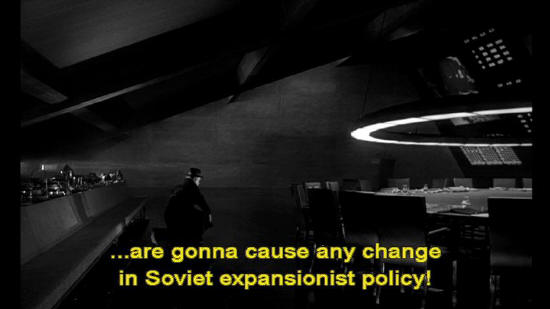 General Turgidson: Yeah, it'd be extremely naive of us to imagine that these new developments ... ... are gonna cause any change in Soviet expansionist policy! I mean, we must be increasingly on the alert ... ... to prevent them from taking over mineshaft space ...