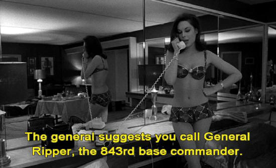 Do I have to think of everything? Miss Scott: The general suggests you call General Ripper, the 843rd base commander. All communications are dead. General Turgidson: Bull! Tell him to do it himself.