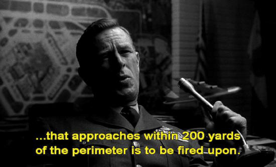First: trust no one, whatever his uniform or rank ... unless he is known to you personally. Second: anyone or anything ... ... that approaches within 200 yards of the perimeter is to be fired upon.