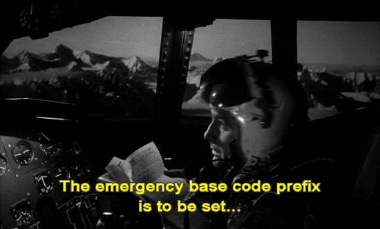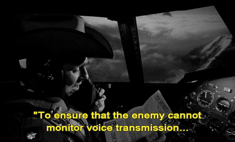 "To ensure that the enemy cannot monitor voice transmission ... ... or plant false transmission ... ... the CRM 114 is to be switched into all receiver circuits. The emergency base code prefix is to be set ...