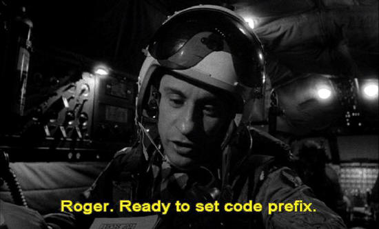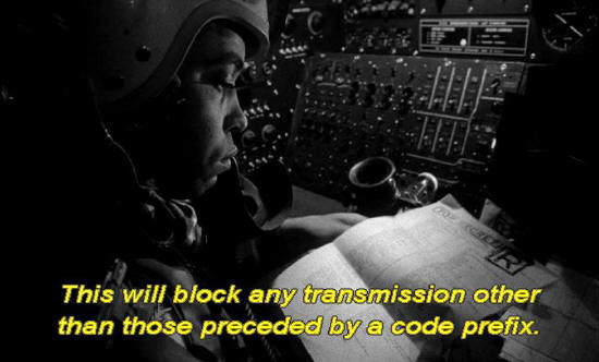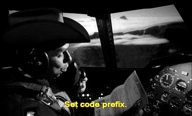 ... on the dials of the CRM. This will block any transmission other than those preceded by a code prefix." Standby by to set code prefix. Goldie: Roger. Ready to set code prefix. Major Kong: Set code prefix.