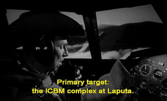 Major Kong: Primary target: the ICBM complex at Laputa. Target reference: Yankee-Golf-Tango, 360. Thirty-megaton nuclear device fused for airburst at 10,000 feet.