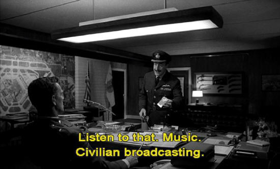 Captain Mandrake: Excuse me, sir. Something rather interesting has just cropped up. Listen to that. Music. Civilian broadcasting. I think the Pentagon has given us an exercise to test our readiness.