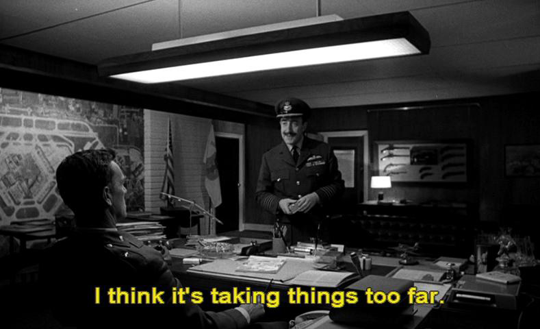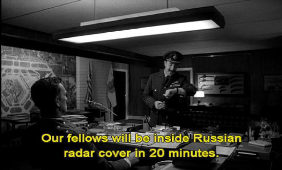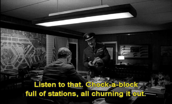 I think it's taking things too far. Our fellows will be inside Russian radar cover in 20 minutes. Listen to that. Chock-a-block full of stations, all churning it out. General Jack Ripper: Mandrake? Captain Mandrake: Yes, sir?