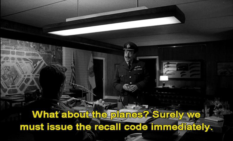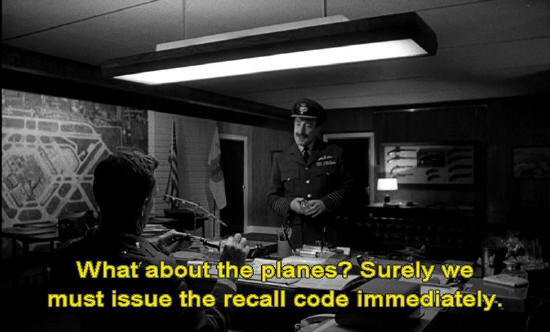 We don't want to start a nuclear war unless we really have to, do we? General Jack Ripper: Please sit down. And turn that thing off. Captain Mandrake: Yes, sir. What about the planes? Surely we must issue the recall code immediately.