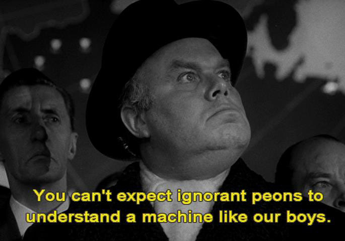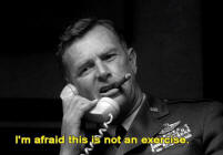 Johnson Directed and Produced by Stanley Kubrick Clerk: General Ripper, sir. Capt. Mandrake: Group Captain Mandrake speaking. General Jack Ripper: This is General Ripper speaking. Captain Mandrake: Yes, sir. General Jack Ripper: Do you recognize my voice? Captain Mandrake: I do, sir. Why do you ask? General Jack Ripper: Why do you think I ask? Captain Mandrake: Well, I don't know, sir. We spoke just a few moments ago, didn't we? General Jack Ripper: You don't think I'd ask unless it was pretty damned important, do you? Captain Mandrake: No, I don't, sir, no. General Jack Ripper: Let's see if we can stay on the ball. Has the wing confirmed holding at their fail-safe points? Captain Mandrake: Yes, sir. The confirmations have all just come in. General Jack Ripper: Very well. Now, listen to me carefully. The base is being put on condition red. I want this flashed to all sections immediately. Captain Mandrake: Condition red. Jolly good idea. Keeps the men on their toes. General Jack Ripper: I'm afraid this is not an exercise. Captain Mandrake: Not an exercise, sir? General Jack Ripper: I shouldn't tell you this, but you're a good officer and have a right to know. It looks like we're in a shooting war. Captain Mandrake: Oh, hell. Are the Russians involved? General Jack Ripper: That's all I've been told. It came in on the red phone. I'm gonna follow orders and seal this base tight. Now, I want you to transmit Plan R, R for Robert, to the wing. Plan R for Robert. Captain Mandrake: Is it that bad, sir? General Jack Ripper: Looks like it's pretty hairy. Captain Mandrake: Yes, sir. Plan R for Robert, sir. General Jack Ripper: Now, last, and possibly most important, I want all privately-owned radios to be immediately impounded. They might be used to issue instructions to saboteurs. As I previously arranged, Air Police will have lists of all owners. I want every single one of them collected without exception. After you've done that, report back to me. *** Narrator: In order to guard against surprise nuclear attack, America's Strategic Air Command maintains a large force of B-52 bombers airborne 24 hours a day. Each B-52 can deliver a nuclear bomb load of 50 megatons, equal to 16 times the total explosive force of all the bombs and shells used by all the armies in World War II. Based in America, the Airborne Alert Force is deployed from the Persian Gulf to the Arctic Ocean. But they have one geographical factor in common: They are all two hours from their targets inside Russia. *** Goldie: Major Kong, I know you'll think this is crazy, but I just got a message from base over the CRM 114. It decodes as wing attack Plan R. R for Romeo. Major Kong: Goldie, did you say wing attack Plan R? Goldie: Yes, sir, I have Major Kong: Goldie, how many times have I told you guys that I don't want no horsing around on the airplane? Goldie: I'm not horsing around, sir, that's how it decodes. Major Kong: Well, I've been to one world fair, a picnic and a rodeo, and that's the stupidest thing I ever heard over earphones. You sure you got today's code? Goldie: Yes, sir, it is. Major Kong: There's just gotta be something wrong. Wait a second, I'm coming back. Maybe you'd better get a confirmation from base. Goldie: Yes, sir. Bombardier: Major Kong, is it possible this is some kind of loyalty test? Give the go code and then recall to see who would actually go? Major Kong: Ain't nobody ever got the go code yet. Old Ripper wouldn't be giving us Plan R unless them Russkies had clobbered Washington and a lot of other towns with a sneak attack. Bombardier: Yes, sir. Goldie: Major Kong, message from base confirmed. Major Kong: Well, boys, I reckon this is it. Nuclear combat toe-to-toe with the Russkies. Now, look, boys, I ain't much of a hand at making speeches. But I got a pretty fair idea that something doggone important is going on back there. Now, I've got a fair idea of the kind of personal emotions that some of you fellows may be thinking. Heck, I reckon you wouldn't even be human beings if you didn't have strong personal feelings about nuclear combat. But I want you to remember one thing: That folks back home is counting on you, and by golly, we ain't about to let them down. Tell you something else. If this thing turns out to be half as important as I figure it just might be, I'd say that you're all in line for some important promotions and personal citations when this thing's over with. And that goes for every last one of you, regardless of your race, color or your creed. Now, let's get this thing on the hump. We got some flying to do. *** Miss Scott: Buck, should I get it? General Turgidson: Yeah, you have to. Miss Scott: Hello? Yes, General Turgidson is here, but he can't come to the phone at the moment. Well, this is his secretary, Miss. Scott. Freddie, how are you? Fine, and you? Oh, we were just catching up on some of the general's paperwork. Well, look, Freddie, he's tied up at the moment. I'm afraid he can't come to the phone. Just a minute. General Turgidson, a Colonel Puntrich calling. General Turgidson: Tell him to call back. Miss Scott: Freddie, the general says could you call back in a minute or two? -- [to Buck] He says it can't wait. General Turgidson: For Pete's -- Find out what he wants. Miss Scott: Freddie, the thing is, the general is in the powder room right now. Could you tell me what it's about? Just a second. -- [to Buck] Apparently they monitored a transmission eight minutes ago from Burpelson Air Force Base. Right. It was directed to the 843rd bomb wing on airborne alert. It decoded as wing attack Plan R. General Turgidson: Well, tell him to call what's-his-name, the base commander. Ripper. Do I have to think of everything? Miss Scott: [To Freddie] The general suggests you call General Ripper, the 843rd base commander. [To Buck] All communications are dead. General Turgidson: Bull! Tell him to do it himself. Miss Scott: Freddie, the general asks if you could possibly try again yourself. I see. -- [