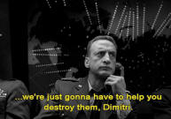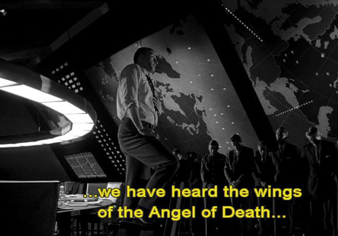 Stanley Kubrick, Terry Southern & Peter George (Screenplay transcribed from the movie by Tara Carreon, american-buddha.com) It is the stated position of the U.S. Air Force that their safeguards would prevent the occurrence of such events as are depicted in this film. Furthermore, it should be noted that none of the characters portrayed in this film are meant to represent any real persons living or dead. Narrator: For more than a year, ominous rumors had been privately circulating among high-level Western leaders that the Soviet Union had been at work on what was darkly hinted to be the ultimate weapon: a doomsday device. Intelligence sources traced the site of the top-secret Russian project to the perpetually fog-shrouded wasteland below the Arctic peaks of the Zhokhov Islands. What they were building, or why it should be located in such a remote and desolate place, no one could say. Columbia Pictures