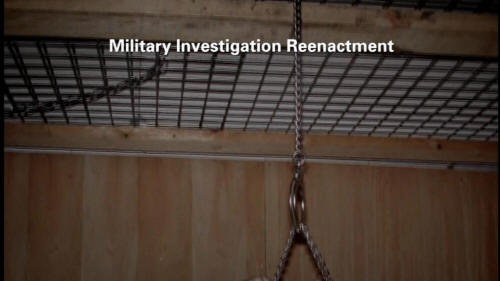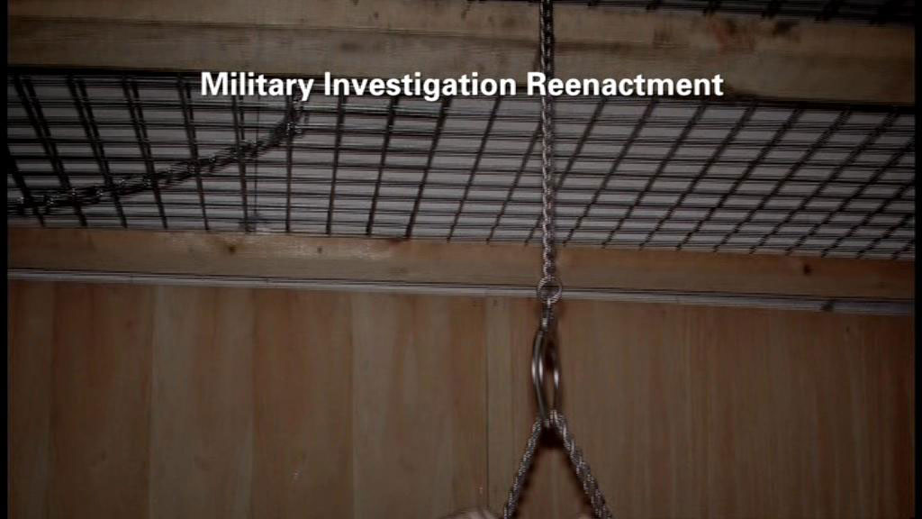 Military Investigation Reenactment and you just kind of chain them up like that ... out to the sides, like this. [Narrator] Forced standing for long periods had inflamed tissue damage from blows to Dilawar's legs. But the initial Bagram press release failed to mention overhead shackling and beatings. It declared that both detainees had died of natural causes. _______________