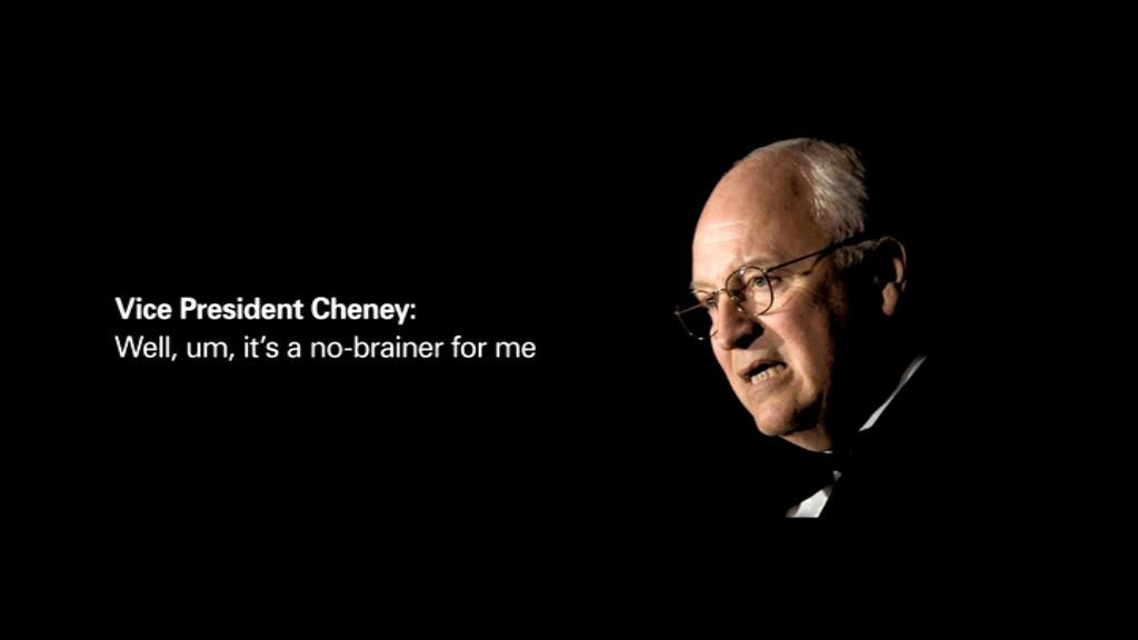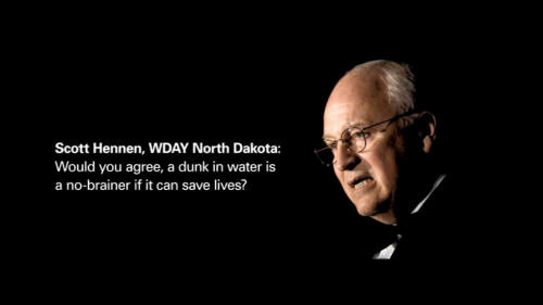 35% of Americans polled believed that torture was acceptable under some circumstances. Murdered detainee, Abu Ghraib Even after the Abu Ghraib photographs. And I think that shows the way that this kind of popular culture has built a constituency for torture ... which allows the Bush White House to get away with the way it twists laws and treaties ... and doesn't spark popular outrage. [Narrator] On a conservative radio show, Vice-President Dick Cheney openly defended the practice of waterboarding. [Scott Hennen, WDAY North Dakota] Would you agree, a dunk in water is a no-brainer if it can save lives? [Dick Cheney, Vice President] Well, um, it's a no-brainer for me ...