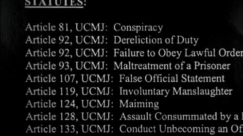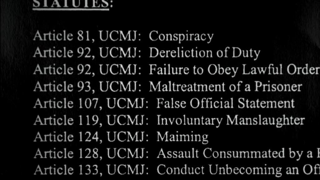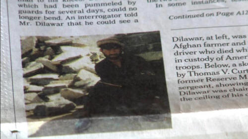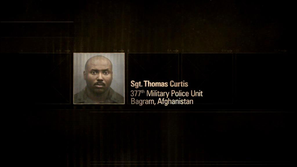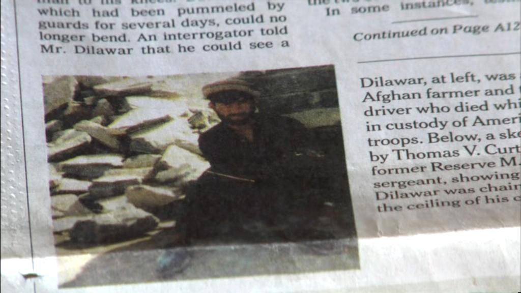 [Sgt. Thomas Curtis, Military Police, Bagram] I saw his picture in the New York Times article. Before that picture, I couldn't have picked his face out, you know. My memory of him was chained up, with the hood on, though sleeping. [Narrator] Following questions raised by the New York Times, and under scrutiny about the Abu Ghraib scandal, the Army finally stepped up the Dilawar investigation, and began charging soldiers with maltreatment, maiming and homicide. [Sgt. Thomas Curtis, Military Police, Bagram] When you're working, you know, with an organization like the Military, you know, they are going to hold somebody accountable. You can sweep some things under the rug, but, you know, this was a death. There was two deaths. And okay, fine, they are going to charge people. Sgt. Thomas Curtis, 377th Military Police Unit, Bagram, Afghanistan [Sgt. Anthony Morden, 377th Military Police Unit, Bagram, Afghanistan] It seemed like the Military, now after they got a black eye from Abu Ghraib, wanted to get a public opinion that they were policing their soldiers. And so they said, "We had this incident that happened a couple of years ago.
