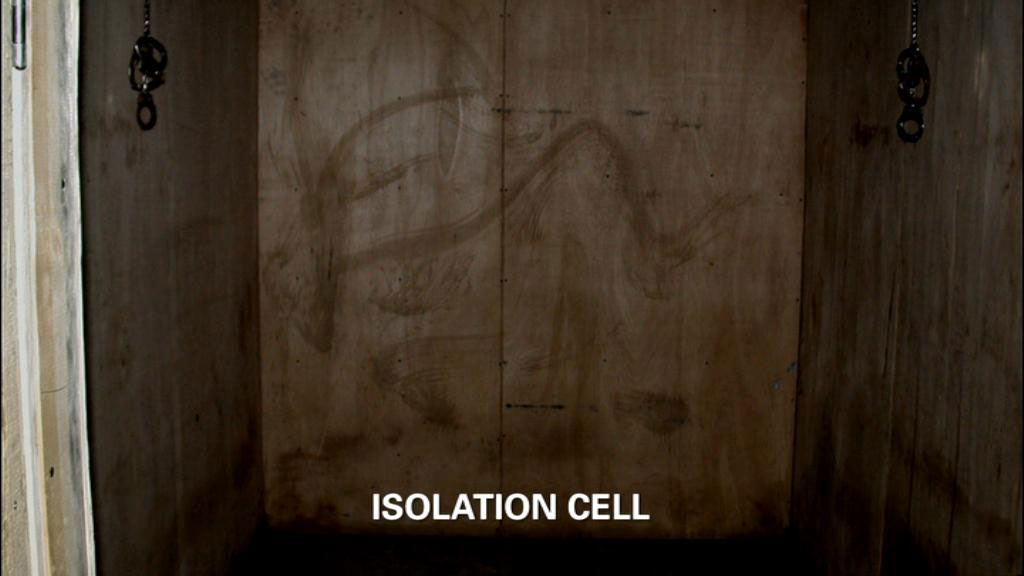 [Sgt. Thomas Curtis, Military Police, Bagram] Keep in mind, in their culture, that dog's more shocking to them than it is to us. Kind of like a woman telling them what to do. You know, it's a cultural thing. So you get more bang for your buck, you know, with a dog. [Moazzam Begg, British subject detained at Bagram and Guantanamo 2002-2005] And then to be re-shackled, completely naked, and to do what they call "The Body Search," the cavity search, and then to be questioned naked, shivering. [Pfc. Willie Brand, Military Police, Bagram] After they are read their rules and everything, they are taken to their cell, to where they're going to be put in sleep deprivation for 24 hours. That's standard for everybody. ISOLATION CELL Then, from there, MI directs us that they can go to general population, or if they have to stay in isolation. And if they are going to stay in isolation, if they are going to be allowed to sleep. And if they can, then when. [Narrator] To weaken the defenses of detainees, interrogators ordered Military Police to find ways of keeping the prisoners awake.