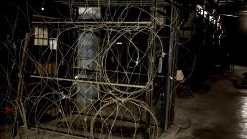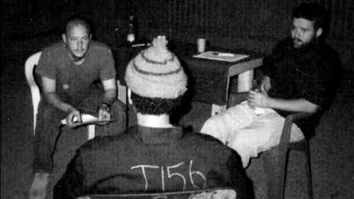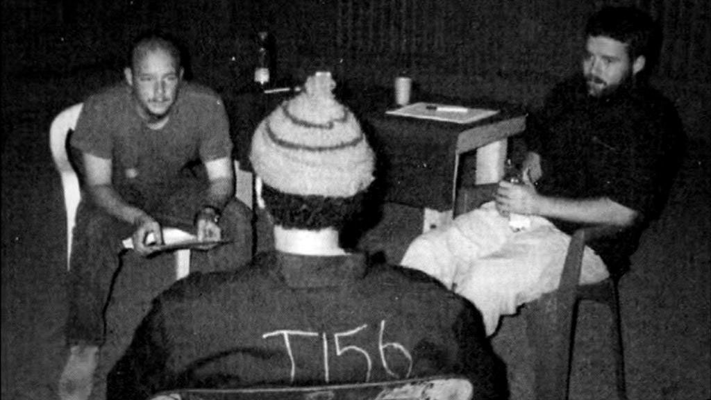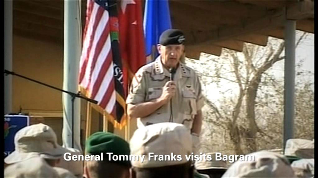 So that would be an hour up. He's got to stand up for one hour. And then you may see a "2" with an arrow pointing down. That means he can sit down for two hours. [Tim Golden, New York Times Reporter] The prisoners were kept in these big pens downstairs. And their numbers would be scribbled on the door of the airlock, which was the little passageway that they were taken out of when they were brought up to the isolation cells upstairs. [Moazzam Begg, British subject detained at Bagram and Guantanamo 2002-2005] Detainees were actually chained, with their hands above their heads, in these airlocks. His number, "421," was something I could see often, because his back was towards me in the airlock ... and the numbers were written on the backs of the detainees in black marker. And we all had that. As well as on the front. My number in Bagram was 180. But later it became "558." [US Chief of Staff, Richard Myers visits Bagram] Thank you. It's good to be with you. It's good to be here in Bagram. General Tommy Franks visits Bagram