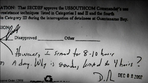 And it was that cover memo that requested authorization of ... the application of certain interrogation techniques. And the top memo gave Secretary Rumsfeld's approval for the application of some of those techniques. It's the memo with Secretary Rumsfeld's handwritten notations on the bottom saying that he stands 8-10 hours a day -- How come these detainees are only required to stand up to four hours a day? I was astounded! But my first reaction was that this was a mistake! Somebody just didn't read the documents carefully enough. [Tim Golden, New York Times Journalist] I think people in the Pentagon thought of Alberto Mora as a loyal, Republican, political appointee.