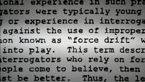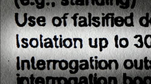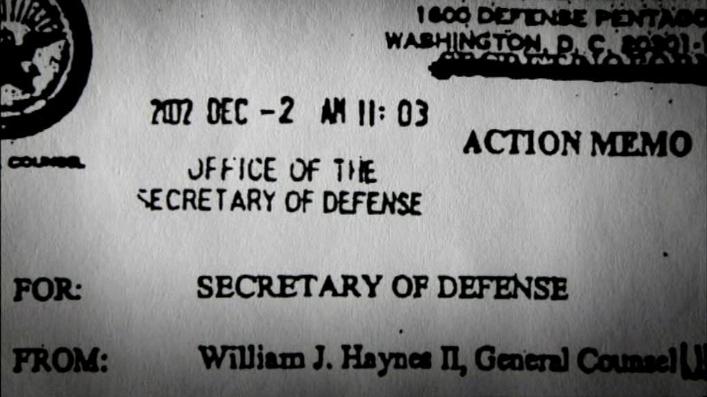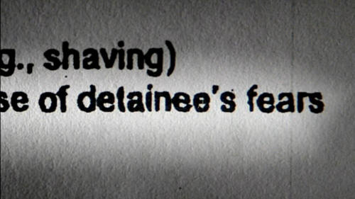 "Detainee's specific phobia techniques": the snakes, the bats, the rats, lock somebody up in a coffin --- you're limited only by your imagination. Any one of these techniques individually could yield the results of torture. Certainly, in combination, you could reach that fairly quickly. [Dr. Donald O. Hebb] See, if you put a person into this procedure, and keep them there for more than the six or eight days that I would think might be the maximum tolerability ... then the price is pretty high. [Narrator] The price is someone's sanity? [Dr. Donald O. Hebb] Presumably, it could be. [Alberto Mora, General Counsel to the Navy, 2001-2006] The medical literature had a phenomenon called "force drift," that made it almost inevitable that the interrogators would continue applying greater and greater increments of force to achieve their desired results. [Col. Lawrence Wilkerson, former Chief of Staff to Colin Powell] For example, take Secretary Rumsfeld's memo: And to say that, "Well, look, he said that dogs have to be muzzled."