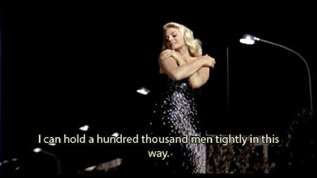 These arms of mine can hold more than a hundred men at once, and they can crush them. When I sway my hips, regiments of men quiver with desire. And if I lower my lashes, and look like this at someone, |