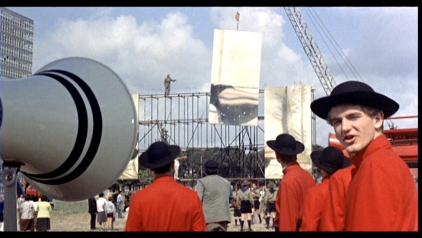 All right. That's about the right height, boys. Lower her down. Down. Lower. Down. Get her to the right a little. Down, will you? Easy does it. Easy. [Cleric] Hey, Hugo. Come here and take a look at this. [Workman] Hey, get away. Don't touch the loudspeaker. Watch what you're doing, will you? Now take it a little over to the left. Hold it. Hey, what are you looking at? Go get the hose, will you? |