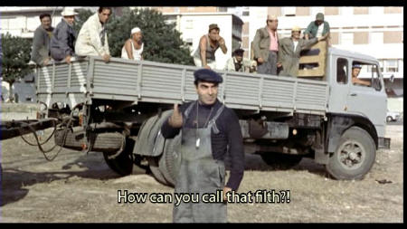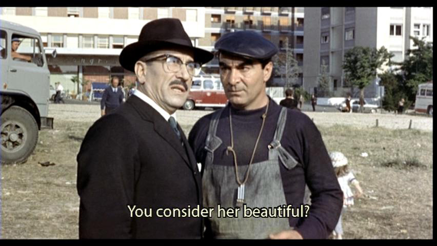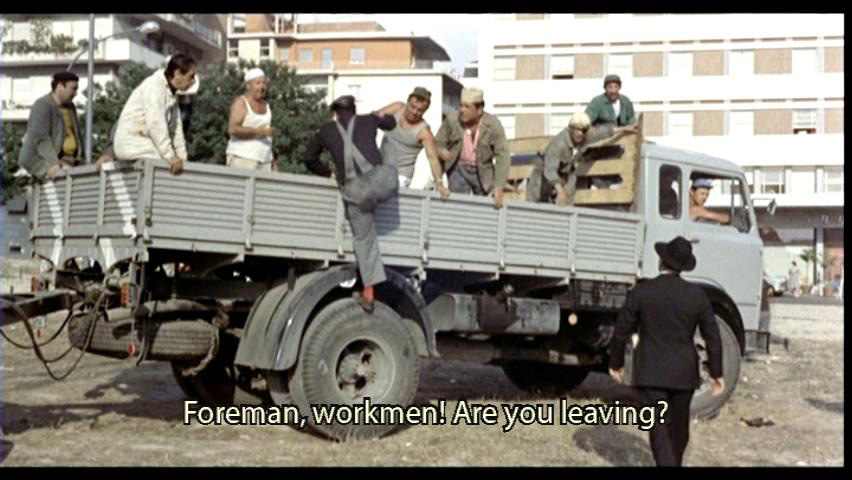 [Workman] But if I would put on a piece of paper there, why the poster would lose its beauty. [Antonio] In other words, you consider it beautiful? [Workman] Come on! We're all ready to leave. [Workman:]Mister, I don't consider her filth, that's for sure. So long. I gotta go. Give me a hand, boys! [Antonio] Just a minute. Don't go away. Listen to me. What's your hurry? Don't go! You've got to stay and do something! You can't go and leave it that way. Please! You'll be sorry you ever did this, you hear? |