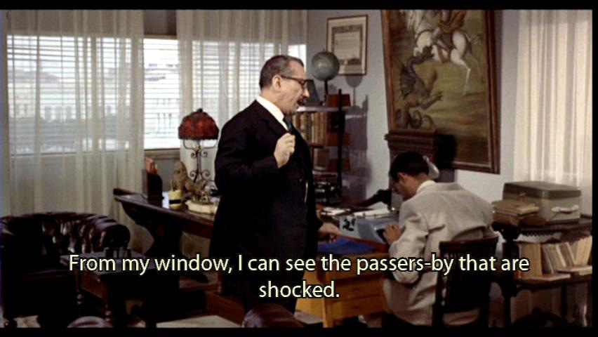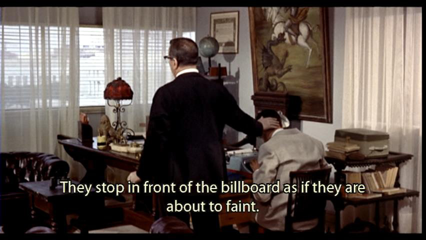 [Antonio] And the days all pass along. They pass, and then they become weeks, and this scandalous thing never ends. The poison keeps oozing out of that obscene poster, more frightful than the most frightful atom fallout. From my window, I can see the crowd of people stopping to look at the poster and -- keep writing son -- and acting as if they were suddenly seized by an unaccountable attack of dizziness. Interrupting their healthy bracing stroll of an evening, |
