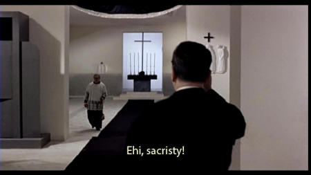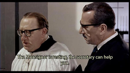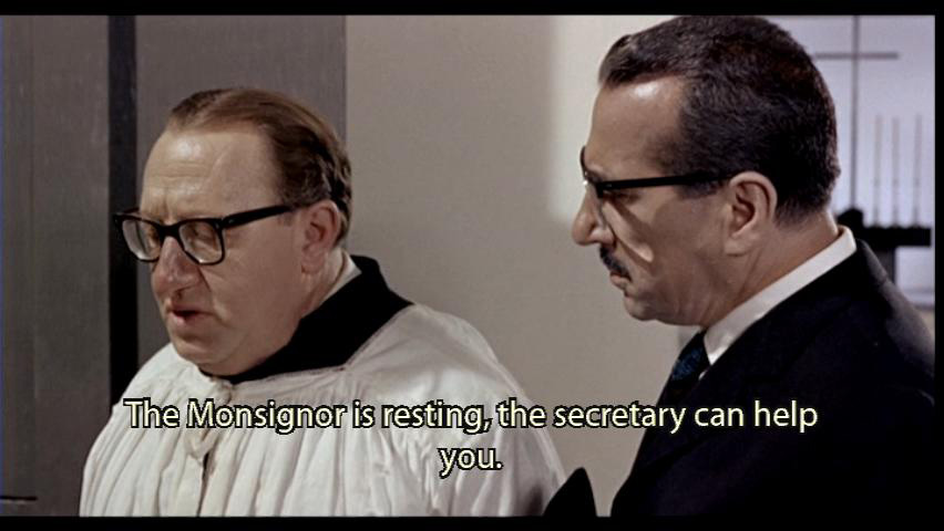 Oh, sexton. I have an appointment with the Bishop. Tell him that Mr. Mazzuolo is calling. [Sexton] The Bishop is indisposed. You can see his secretary. |