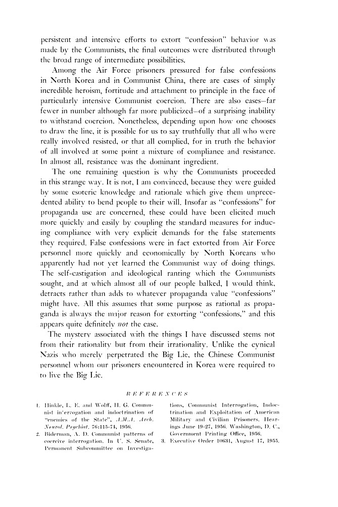 Insofar as the data we have from our Korean War cases is concerned, this chart is a mixture of theoretical and actual behaviors. For our Korean War cases. the behaviors at the extreme of compliance are completely theoretical -- they did not occur. At the other extreme, that of resistance, the behaviors occurred only during the first states of pressure, or when the coercive attempts were unusually brief, unskilled or prematurely terminated by external events. In all our cases where persistent and intensive efforts to extort "confession" behavior was made by the Communists, the final outcomes were distributed through the broad range of intermediate possibilities. Among the Air Force prisoners pressured for false confessions in North Korea and in Communist China, there are cases of simply incredible heroism, fortitude and attachment to principle in the face of particularly intensive Communist coercion. There are also cases -- far fewer in number although far more publicized -- of a surprising inability to withstand coercion. Nonetheless, depending upon how one chooses to draw the line, it is possible for us to say truthfully that all who were really involved resisted, or that all complied, for in truth the behavior of all involved at some point a mixture of compliance and resistance. In almost all, resistance was the dominant ingredient. The one remaining question is why the Communists proceeded in this strange way. It is not, I am convinced, because they were guided by some esoteric knowledge and rationale which give them unprecedented ability to bend people to their will. Insofar as "confessions" for propaganda use are concerned, these could have been elicited much more quickly and easily by coupling the standard measures for inducing compliance with very explicit demands for the false statements they required. False confessions were in fact extorted from Air Force personnel more quickly and economically by North Koreans who apparently had not yet learned the Communist way of doing things. The self-castigation and ideological ranting which the Communists sought, and at which almost all of our people balked, I would think, detracts rather than adds to whatever propaganda value "confessions" might have. All this assumes that some purpose as rational as propaganda is always the major reason for extorting "confessions," and this appears quite definitely not the case. The mystery associated with the things I have discussed stems not from their rationality but from their irrationality. Unlike the cynical Nazis who merely perpetrated the Big Lie, the Chinese Communist personnel whom our prisoners encountered in Korea were required to live the Big Lie. _______________ References 1. Hinkle, L.E. and Wolff, H.G. Communist Interrogation and indoctrination of "enemies of the State", A.M.A. Arch. Neurol. Psychiat 76:115-74, 1956. 2. Biderman. A.D. Communist patterns of coercive interrogation. In U.S. Senate, Permanent Subcommittee on Investigations, Communist Interrogation, Indoctrination and Exploitation of American Military and Civilian Prisoners. Hearings June 19-27, 1956. Washington, D.C., Government Printing Office, 1956. [Not Available from the Government Printing Office -- Out of Print as of 7/21/08 -- Consult local library]