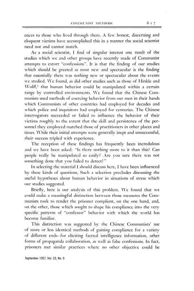 Greenberg, Joshua L. Dratel The United States Air Force has expended considerable effort to get a full, accurate and meaningful account of what happened to its personnel who were captured in Korea. I have been associated with these studies since their beginnings three years ago. Because we believe the experiences of our returned prisoners of war can tell us much about the nature of a potential enemy, about the soldier and airman, and about man, generally, these studies are continuing. Of the 235 Air Force men who were returned by the Chinese Communists after the Korean Armistice -- two years after, in the case of 15 of these men -- about half had some direct personal experience with Communist attempts to extort false confessions. We know one airman died during such an attempt. There may have been others. The attempts made against these men, the reasons for these attempts and the reactions of the men themselves comprise a very involved series of stories. The record of each of the long interviews conducted with these men after their return would engross you, I am sure. Almost all are exciting stories of individual heroism and perseverance. There is an almost unmatched drama in these airmen's efforts to protect principles, dignity and self-respect with only their own inner resources to sustain them. A few of the stories do not have completely happy endings and all of them reveal something about human imperfection. Our objective here is science, however, not drama. Therefore I won't attempt what in any event I could probably not do well; that is, to relate in the space of a few minutes the meaning of these experiences to those who lived through them. A few honest, discerning and eloquent victims have accomplished this in a manner the social scientist need not and cannot match. As a social scientist, I find of singular interest one result of the studies which we and other groups have recently made of Communist attempts to extort "confessions". It is that the finding of our studies which should be greeted as most new and spectacular is the finding that essentially there was nothing new or spectacular about the events we studied. We found, as did other studies such as those of Hinkle and Wolff, [1] that human behavior could be manipulated within a certain range by controlled environments. We found that the Chinese Communists used methods of coercing behavior from our men in their hands which Communists of other countries had employed for decades and which police and inquisitors had employed for centuries. The Chinese interrogators succeeded or failed to influence the behavior of their victims roughly to the extent that the skill and persistence of the personnel they employed matched those of practitioners in other places and times. While their initial attempts were generally inept and unsuccessful, their success tripled with experience. The reception of these findings has frequently been incredulous and we have been asked: "Is there nothing more to it than this? Can people really be manipulated so easily? Are you sure there was not something done that you failed to detect?" In selecting the material I should discuss here, I have been influenced by these kinds of questions. Such a selection precludes discussing the useful hypotheses about human behavior in situations of stress which our studies suggested. Briefly, here is our analysis of this problem. We found that we could make a meaningful distinction between thoese measures the Communists took to render the prisoner compliant, on the one hand, and, on the other, those which sought to shape his compliance into the very specific patterns of "confessor" behavior with which the world has become familiar. This distinction was suggested by the Chinese Communists' use of more or less identical methods of gaining compliance for a variety of different ends -- for eliciting factual intelligence information, other forms of propaganda collaboration, as well as false confessions. In fact, prisoners met similar practices where no other objective could be discerned but compliance for its own sake. The methods of gaining compliance they used included nothing which was not common practice to police and intelligence interrogators of other times and nations, where restraints precluding such tactics were not in force. Numerous historical examples existed where such practices produced behavior as greatly at variance with principles, self-interest and survival of the victim as any which occurred in North Korea and Communist China. The methods they used to shape compliance into the now familiar pattern of the forced confession, we believe, can be understood as essentially a teaching procedure -- teaching the prisoner how to comply. It was a complex teaching procedure, however. Its complexities were due to the elaborate and complex behavior which was sought, as well as to the fact that this behavior was so alien and offensive to the prisoner. It was further complicated by irrational aspects of the system within which the Communist interrogator operated. The system required him to teach without making his lessons explicit. I should point out that the distinction between inducing compliance and shaping compliance is purely an analytic division. The two kinds of methods are not independent of one another nor separate in time. I would like to discuss first the measured used by the Communists to induce compliance: to undermine the resistance of the prisoner. The experiences of American Air Force prisoners of war in Korea who were pressured for false confessions, enabled us to compile an outline of methods of eliciting compliance, [2] not much different, it turned out, from those reported by persons held by Communists of other nations. I have prepared a chart showing a condensed version of this outline. It shows our analysis of these techniques into eight general measures, some illustrations of the specific forms these measures take, and our judgment of the effect of each