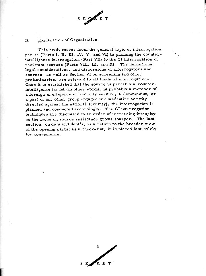 This manual cannot teach anyone how to be, or become, a good interrogator. At best it can help readers to avoid the characteristic mistakes of poor interrogators. Its purpose is to provide guidelines for KUBARK interrogation, and particularly the counterintelligence interrogation of resistant sources. Designed as an aid for interrogators and others immediately concerned, it is based largely upon the published results of extensive research, including scientific inquiries conducted by specialists in closely related subjects. There is nothing mysterious about interrogation. It consists of no more than obtaining needed information through responses to questions. As is true of all craftsmen, some interrogators are more able than others; and some of their superiority may be innate. But sound interrogation nevertheless rests upon a knowledge of the subject matter and on certain broad principles, chiefly psychological, which are not hard to understand. The success of good interrogators depends in large measure upon their use, conscious or not, of these principles and of processes and techniques deriving from them. Knowledge of subject matter and of the basic principles will not of itself create a successful interrogation, but it will make possible the avoidance of mistakes that are characteristic of poor interrogation. The purpose, then, is not to teach the reader how to be a good interrogator but rather to tell him what he must learn in order to become a good interrogator. The interrogation of a resistant source who is a staff or agent member of an Orbit intelligence or security service or of a clandestine Communist organization is one of the most exacting of professional tasks. Usually the odds still favor the interrogator, but they are sharply cut by the training, experience, patience and toughness of the interrogatee. In such circumstances the interrogator needs all the help that he can get. And a principal source of aid today is scientific findings. The intelligence service which is able to bring pertinent, modern knowledge to bear upon its problems enjoys huge advantages over a service which conducts its clandestine business in eighteenth century fashion. It is true that American psychologists have devoted somewhat more attention to Communist interrogation techniques, particularly "brainwashing", than to U.S. practices. Yet they have conducted scientific inquiries into many subjects that are closely related to interrogation: the effects of debility and isolation, the polygraph, reactions to pain and fear, hypnosis and heightened suggestibility, narcosis, etc. This work is of sufficient importance and relevance that it is no longer possible to discuss interrogation significantly without reference to the psychological research conducted in the past decade. For this reason a major purpose of this study is to focus relevant scientific findings upon CI interrogation. Every effort has been made to report and interpret these findings in our own language, in place of the terminology employed by the psychologists. This study is by no means confined to a resume and interpretation of psychological findings. The approach of the psychologists is customarily manipulative; that is, they suggest methods of imposing controls or alterations upon the interrogatee from the outside. Except within the Communist frame of reference, they have paid less attention to the creation of internal controls -- i.e., conversion of the source, so that voluntary cooperation results. Moral considerations aside, the imposition of external techniques of manipulating people carries with it the grave risk of later lawsuits, adverse publicity, or other attempts to strike back. B. Explanation of Organization This study moves from the general topic of interrogation per se (Parts I, II, III, IV, V, and VI) to planning the counterintelligence interrogation (Part VII) to the CI interrogation of resistant sources (Parts VIII, IX, and X). The definitions, legal considerations, and discussions of interrogators and sources, as well as Section VI on screening and other preliminaries, are relevant to all kinds of interrogations. Once it is established that the source is probably a counterintelligence target (in other words, is probably a member of a foreign intelligence or security service, a Communist, or a part of any other group engaged in clandestine activity directed against the national security), the interrogation is planned and conducted accordingly. The CI interrogation techniques are discussed in an order of increasing intensity as the focus on source resistance grows sharper. The last section, on do's and dont's, is a return to the broader view of the opening parts; as a check-list, it is placed last solely for convenience. Most of the intelligence terminology employed here which may once have been ambiguous has been clarified through usage or through KUBARK instructions. For this reason definitions have been omitted for such terms as burn notice, defector, escapee, and refugee. Other definitions have been included despite a common agreement about meaning if the significance is shaded by the context. 1. Assessment: the analysis and synthesis of information, usually about a person or persons, for the purpose of appraisal. The assessment of individuals is based upon the compilation and use of psychological as well as biographic detail. 2. Bona fides: evidence or reliable information about identity, personal (including intelligence) history, and intentions or good faith. 3. Control: the capacity to generate, alter, or halt human behavior by implying, citing, or using physical or psychological means to ensure compliance with direction. The compliance may be voluntary or involuntary. Control of an interrogatee can rarely be established without control of his environment. 4. Counterintelligence interrogation: an interrogation (see #7) designed to obtain information about hostile clandestine activities and persons or groups engaged there