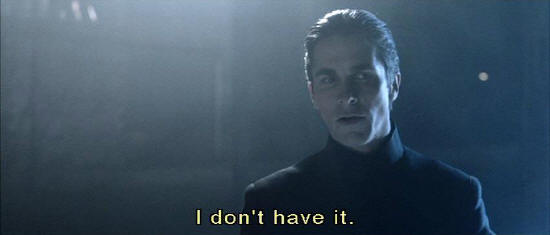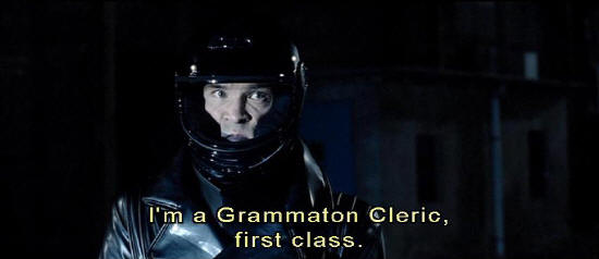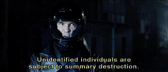 [Preston] I don't have it. [Tetragrammaton] Unidentified individuals are subject to summary destruction. [Preston] You're making a very big mistake. I'm a Grammaton Cleric, First class. [Tetragrammaton] We're gonna search your vehicle. [Preston] No, you're not. There's nothing in it. [Tetragrammaton] Search it!