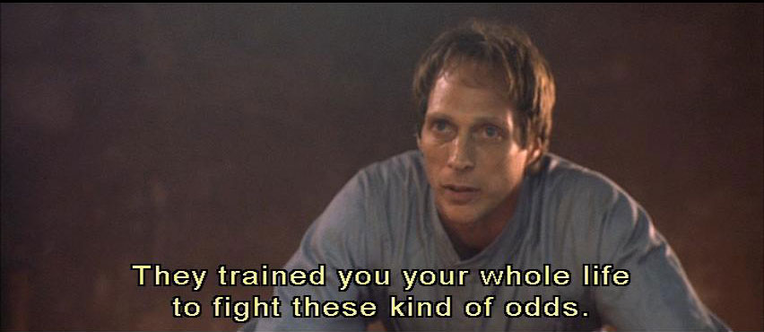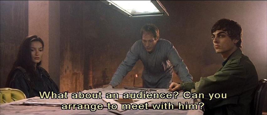 [Preston] 50 sweepers, maybe more. [Jurgen] What about an audience? Can you somehow arrange to meet with him? [Preston] Father's never given a single audience since the upheaval. The danger of assassination is too great. [Jurgen] They trained you your whole life to fight these kind of odds, Preston. [Preston] Even if I could ... even if I could make it through,
