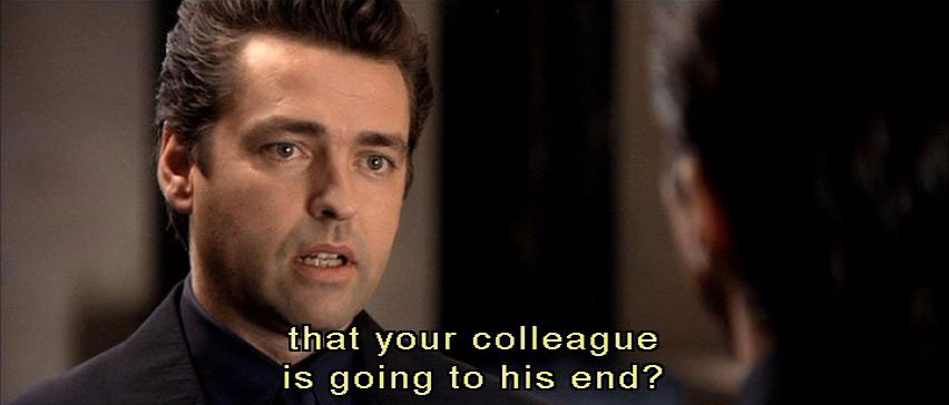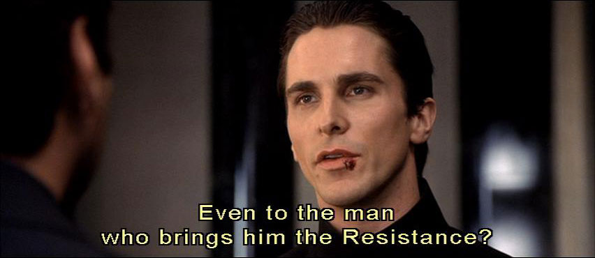 that your colleague is going to his end? [Preston] The only thing that disturbs me, sir, is that I am Father's instrument against the underground, and yet ... I've never had the honor of meeting him. [Dupont] Hmm. Yes, but, Cleric, you know that Father never grants an audience to anyone. [Preston] Even to the man who brings him the resistance? |