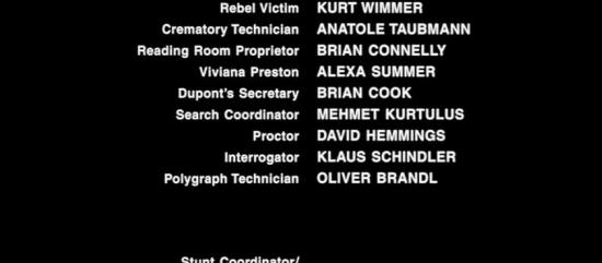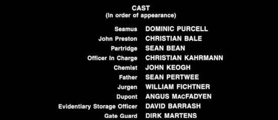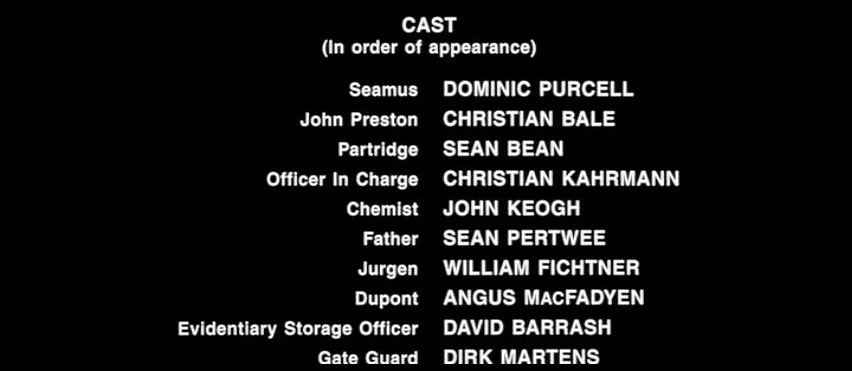 MATTHEW HARBOUR AND WILLIAM FICHTNER CASTING BY JUEL BESTROP, JEANNE MCCARTHY; EUROPEAN CASTING BY LUCINDA SYSON, CDG VISUAL EFFECTS SUPERVISOR: TIM MCGOVERN DIGITAL CITYSCAPES CREATED BY DIGITAL FIREPOWER, INC. A BLUE TULIP PRODUCTION CAST (IN ORDER OF APPEARANCE): Seamus: Dominic Purcell; John Preston: Christian Bale; Partridge: Sean Bean; Officer in Charge: Christian Kahrmann; Chemist: John Keogh; Father: Sean Pertwee; Jurgen: William Fichtner; Dupont: Angus MacFadyen; Evidentiary Storage Officer: David Barrash; Gate Guard: Dirk Martens Brandt: Taye Diggs; Robbie Preston: Matthew Harbour; Preston's Wife: Maria Pia Calzone; Lisa Preston: Emily Siewert; Mary O'Brien: Emily Watson; Enforcer Commander: Mike Smith; Gate Guard: Florian Fitz; Lead Sweeper: Daniel Lee; Rebel Leader: Francesco Calabras; Rebel Victim: Kurt Wimmer Crematory Technician: Anatole Taubmann; Reading Room Proprietor: Brian Connelly; Viviana Preston: Alexa Summer; Dupont's Secretary: Brian Cook; Search Coordinator: Mehmet Kurtulus; Proctor: David Hemmings; Interrogator: Klaus Schindler; Polygraph Technician: Oliver Brandl