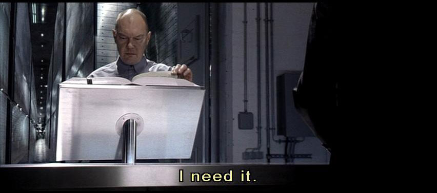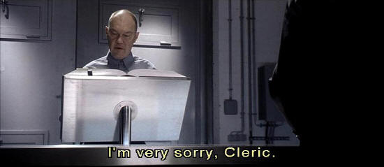 I need it. It was late this afternoon. It may not have showed up in the records yet. [doors whir, click] [Officer] I'm very sorry, Cleric. Nothing has been logged and nothing is pending under that entry. [Preston] It was an item of evidence brought in personally