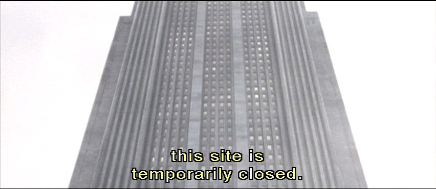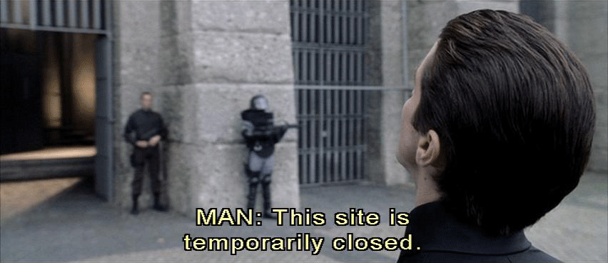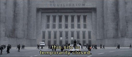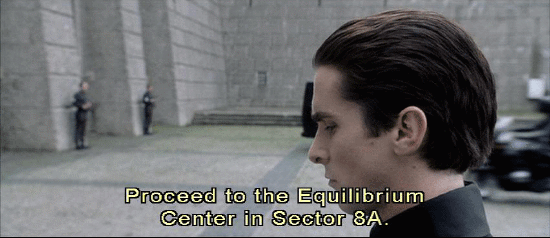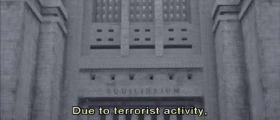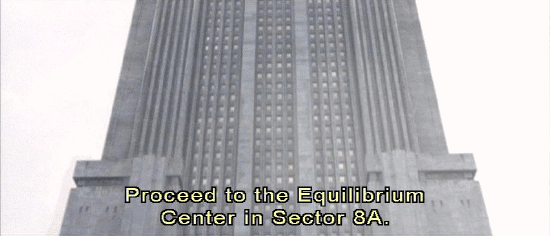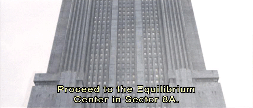 Man and woman alternating: Due to terrorist activity, this site is temporarily closed. Proceed to the Equilibrium center in Sector 8A. Due to terrorist activity, this site is temporarily closed. Man: This site is temporarily closed. Proceed to the Equilibrium Center in Sector 8A.