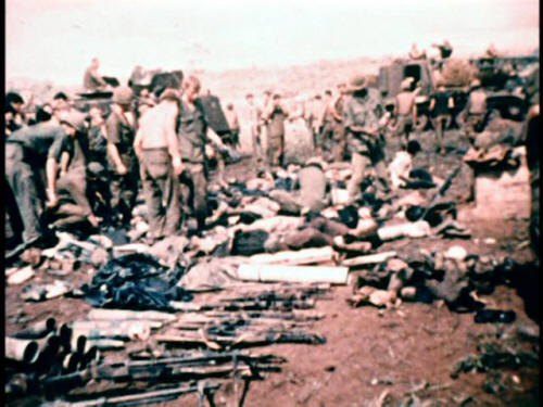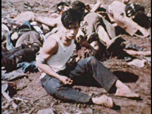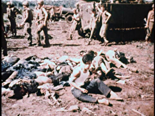 The same POW was forced to sit from probably from 6-8 hours by this pile of bodies in the hot sun. This is a shot of five or six GI's going through the bodies looking for souvenirs. In this picture there is a lieutenant and a captain overlooking what's going on. This is a shot of our interrogator. He took his M-16, he took it and forced it into this prisoner's nose and he twisted it. It's extremely painful. Q. Officers were present at all times? A. Yes, field grade officers were present. And the next slide is a slide of myself. I'm extremely shameful of it. I'm showing it in hopes that none of you people who have never been involved ever let this happen to you. Don't ever let your government do this to you. It's me, holding a dead body, smiling. |