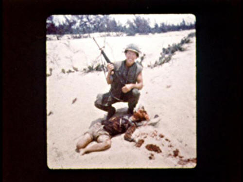 On the way down, because our Company policy was to just keep on firing, I looked out across the field and I spotted a Vietnamese woman, a peasant running away from the ship. I fired a burst of about six or seven rounds into her back before we hit the ground. When I was being questioned as to what happened about two weeks later by a captain in my company, I told him what we did and what I did, and we both had a good laugh about it. That was pretty much company policy. SCOTT CAMILE: I saw a lot of things happening and being done by guys, and I really, like the emotional thing, I mean you see your buddy get killed and it's really emotional. Someone you were really good friends with. Like one minute he's telling you, "I got a letter from my girl, and I'm really happy, and I can't wait to see her, and she's going to send me some pictures she's taken. She's getting her girlfriend to take some nice polaroid pictures of me," you know. And then you go out, and he gets shot in the head, and it was really hard for you to realize that five minutes ago he was your friend and now he's dead. And you put him on the helicopter and you just make believe that he went home. You try not to think he was killed. And then you say, "I'm gonna get the gooks for it." And you just take it out on all the gooks. And it got to be where, it was like someone would say, "Okay, you come stay on my farm, and you can go hunting every day for free and I'll give you all the ammo you want and you can hunt and there's no limit, and you can all go out together and just hunt. And that's what this was like. It was a hunting trip. And the more people we killed, the happier our officers were, you know. |