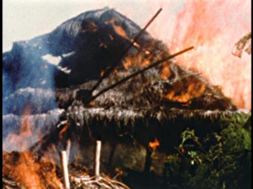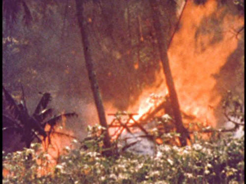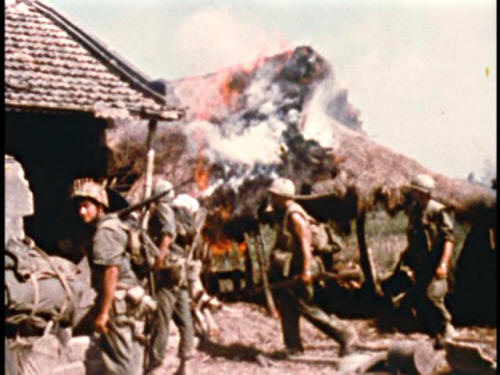 We don't know what happened to them. That was the only village in the immediate vicinity, so we cleared the area more or less. Everything is set on fire. My squad leader personally ignited the first two hootches ... and then just told us to take care of the rest. When we went out, I'd say 50% at least of the villages we passed through would be burned to the ground. There was no difference between some that we burned and the ones we didn't burn. It's just that some we had time and we'd burn them. We were given orders whenever we moved into a village to reconnoiter by fire. |