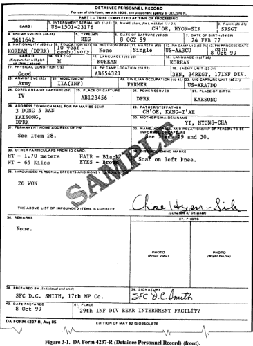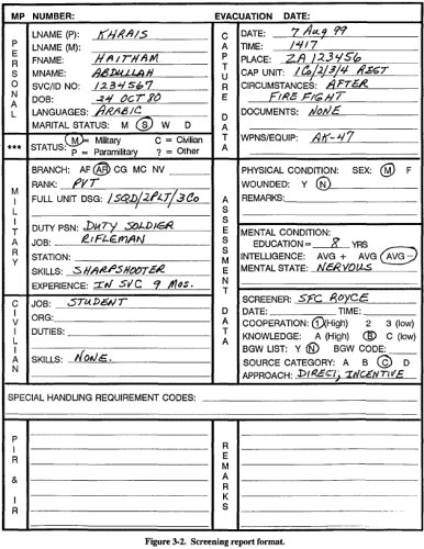 Screeners should obtain a copy of the element's overall objective statement from the PIR, IR, and SIR and become familiar with the intelligence indicators listed there. Screeners must use their experience and imagination to devise ways to identify EPWs and detainees who might possess information pertinent to these indicators. For example, one group of indicators may concern new enemy units moving along a specific avenue of approach. In this case, a screener may want to concentrate first on screening EPWs and detainees captured near that location. When he questions those EPWs or detainees, the screener might try to determine what units are due to arrive in that area in the near future. The ability to recognize branch of service and rank insignia can be of great assistance to screeners. Screeners coordinate with MP holding area guards on their role in the screening process. The guards are told where the screening will take place, how EPWs and detainees are to be brought there from the holding area, and what types of behavior on their part will facilitate the screenings. If time permits, screeners should go to the holding area and examine all available documents pertaining to the EPWs and detainees. They should look for signs that certain EPWs and detainees are willing, or can be induced, to cooperate with the interrogator. Previous screening and interrogation reports and EPW personnel records are important. Interrogation reports identify EPWs and detainees who have been cooperative in the past. Prior screening reports indicate EPWs and detainees who appear cooperative. During EPW inprocessing, MPs prepare a DA Form 4237-R, which is prescribed by AR 190-8. A sample is shown at Figure 3-1. DA Form 4237-R contains additional information not required by the GWS, GPW, and GC, but which the EPWs and detainees may have volunteered during inprocessing. The volunteering of information is one indicator of EPW's or detainee's cooperation. When examining documents, screeners should identify topics on which EPWs and detainees have pertinent information. Screeners should make a note of any documents captured with specific EPWs and detainees that may contain indications of pertinent knowledge and potential cooperation. If time permits, screeners should question holding area personnel about the EPWs and detainees. Since these personnel are in almost constant contact with the EPWs and detainees, their descriptions of specific ones can help identify sources who might answer the supported commander's PIR and IR. Screeners should identify and note those EPWs and detainees whose appearance and behavior indicate they are willing to cooperate immediately or are unlikely to cooperate ever. Unless time is critically short, screeners should --