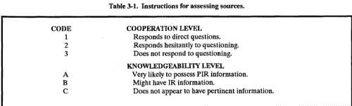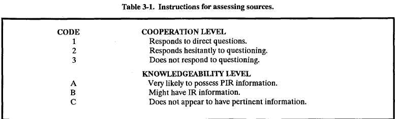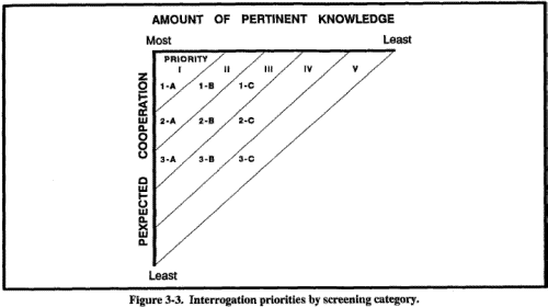 Screeners should always try to screen cooperative knowledgeable EPWs and detainees first. These include EPWs and detainees identified during the screener's review of documents, questioning of holding area personnel, and their own personal observations. Based on screener notes and recommendations, they establish the order which EPWs and detainees will be questioned. The holding area guards are then told to bring these EPWs and detainees, in order, to the screening site one at a time. A screener must use a screening report to record information as it is obtained from the source. Figure 3-2 is a format for a screening report. All information shown is rarely obtained from any one source. The blocks save the screener as much additional writing as possible. If PIR, IR, and SIR information is obtained, it is spot reported in SALUTE formal. When this type of information is obtained during screening, it must be exploited fully and reported as soon as possible. Source screening ends when the screener is sure he can make an accurate assessment of the source's potential cooperation and pertinent knowledge. At this time, the source is returned to the control of the guards, and the screener records his assessment on the screening report. The assessment is recorded using a screening code. The screening code is an alphanumeric designation which reflects the level of cooperation expected from the source and the level of knowledgeability the source may possess. Table 3-1 shows the codes for assessing sources. Those sources who have been assigned to the same category may be interrogated in any order deemed appropriate by the senior interrogator. Category 1A sources normally should be the first to be interrogated; Category 1B, next; followed by those assigned to categories 2A, 1C, 2B, 3A, 2C, and 3B. Category 3C sources are normally interrogated last. This order ensures the highest probability of obtaining the greatest amount of pertinent information within available time. Screening codes may change with the echelon. The higher the echelon, the more time is available to conduct an approach. Figure 3-3 shows the order in which sources will be interrogated. The term "screening category" should not be confused with the categories that are assigned to EPWs and detainees based on their intelligence value. Table 3-1. Instructions for assessing sources.