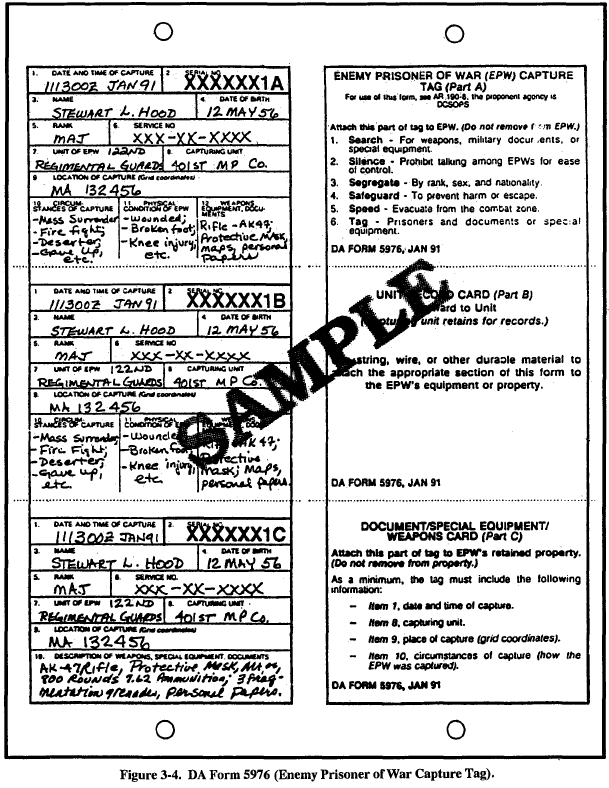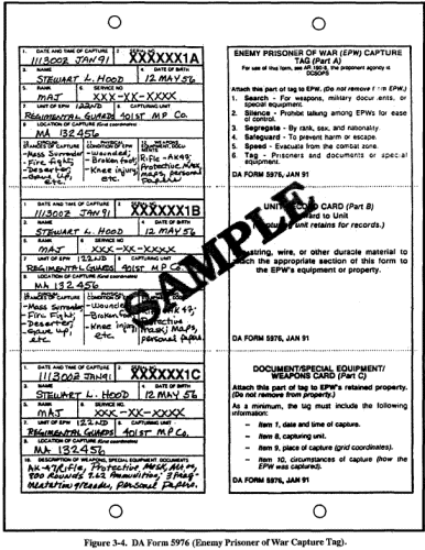 Figure 3-4. DA Form 5976 (Enemy Prisoner of War Capture Tag). The interrogation may require the interrogator conduct research to obtain detailed data on a specific geographic area, political group, weapons system, or technical field. In the technical field, TECHINT personnel assist the interrogator. There are various weapons identification guides to assist the interrogator in identifying any weapons mentioned by the source. However, the source should not be shown this guide until he has thoroughly described the items, or has drawn a picture of the weapons. The interrogator may require maps, documents, recording and photographic equipment, screening reports, and other aids to facilitate the interrogation. From these aids, he must select those best suited to accomplish the objective, determine their availability, and arrange for their procurement well in advance of the interrogation. Some aids the interrogator may use are --