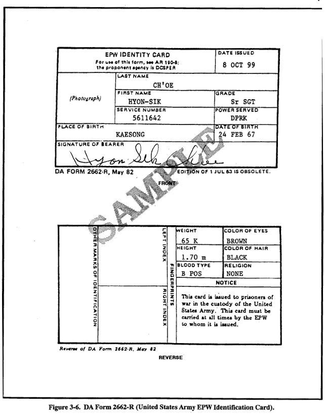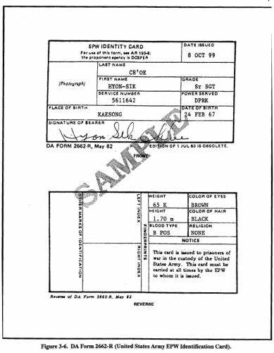Figure 3-6. DA Form 2662-R (United States Army EPW Identification Card). Some reasons for termination are --