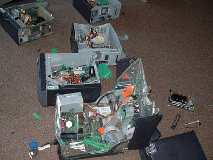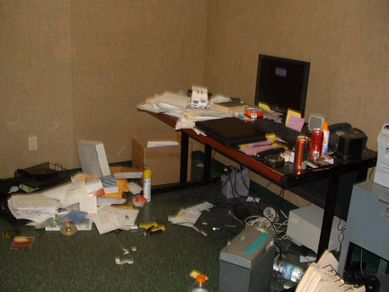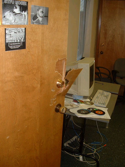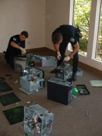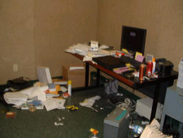 FTW Crippled But Not Dead © Copyright 2006, From The Wilderness Publications, www.fromthewilderness.com. All Rights Reserved. This story may NOT be posted on any Internet web site without express written permission. Contact [email protected]. May be circulated, distributed or transmitted for non-profit purposes only. July 5th, 2006 4:09pm [PST], ASHLAND – Sometime after 7:30 PM on the evening of Sunday June 25, 2006, an unknown number of suspects entered the FTW offices by means of two passkeys. Once inside, a sledgehammer was used to smash through four solid-core doors secured with deadbolt locks to gain entry to our webmaster’s office, my office, the administrative office and a storage area. All seven FTW computers were ripped or disconnected from peripherals and transported to a central unoccupied area of the building where their covers were unscrewed and removed. After the covers had been removed, all seven computers were smashed with sledgehammers. My monitor was also smashed at my desk. The computers were totally destroyed. There are suspects and the Ashland, Oregon police department (APD) is conducting an active criminal investigation. For that reason I am not at liberty to either discuss or disclose certain details, especially the extent of damage to hard drives, back up status before the burglary, or whether data from damaged hard drives is, or will ever be, recoverable. To date I have been impressed by the cooperation and thoroughness shown by APD and I intend to cooperate with them fully and provide whatever assistance I can as their investigation continues. In previous statements I have mentioned a meth ring operating locally and have also stated that I had seen no direct evidence of US government involvement. Those statements are still correct, although I will add that I also have not ruled out US government involvement. The only way to describe the damage is that it has been utterly devastating from business, emotional and professional perspectives. My residence was vandalized a week before the burglary. As I write this report, a full ten days after the burglary, we are still unable to download orders from the internet, and we are also unable to ship any products. We have a large number of orders out there but unfortunately we cannot get any of that money into our checking account at present. We are insured and it appears as though most of the losses will be covered. However, there are going to be significant cash outlays required to resume even a semblance of normal operations before insurance reimbursement takes place. This includes expensive data recovery from certain damaged hard drives. For the time being, please send any donations to our mailing address, 655 Washington St., Ashland, OR 97520, Please indicate if you would like your donation returned once we have received reimbursement from our insurance carrier. We do need all the help we can get. For new subscribers and those concerned about interruption of our services please be advised that, as time permits, we will make arrangements to extend subscriptions to make up for any lost time. I have no words to describe the viciousness of this attack. No other valuables were taken and none of our other furnishings or equipment was destroyed. It is apparent that destroying data stored in our computers was the primary objective in this crime. Current estimated damages are in excess of $20,000. Please do not expect us to be able to immediately respond to emails. We are short-staffed and everyone here is doing a great job under the obvious and very unpleasant stress. We have desperate need for a bookkeeper in house to help reconstruct financial records and restore normal cash flow operations. Our problem is finding one willing to work in our environment. Those of you who have been loyal FTW fans and subscribers know of the many, many challenges we have had to face over the years. I am now 55 years old and have been fighting this fight for a long time. This is a time for a rethinking of all of our priorities. The one question I and the rest of FTW is trying to answer is how can we best serve you without experiencing the same battles again. As the world around us and within the United States grows darker, I intend to use this time to evaluate where we go from here. The first thing I need to do is to consult closely with our writers and several key advisors and friends. FTW is not dead but I must honestly tell you that we are on life support at the moment. As we restore our operations, piece by piece, we will resume the publication of new stories. We promise to finish the Pat Tillman series. Other than that, as those of us who have made FTW work arrive at a plan, we will keep you advised. In the meantime, please let these photographs speak for themselves. Send us whatever help you can, and continue to give us the same loving patience you have always given us as these brutal and difficult challenges have arisen. These are tough times for everyone. Michael C. Ruppert