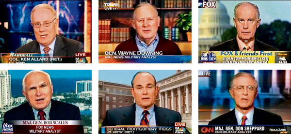 In the summer of 2005, the Bush administration confronted a fresh wave of criticism over Guantánamo Bay. The detention center had just been branded “the gulag of our times” by Amnesty International, there were new allegations of abuse from United Nations human rights experts and calls were mounting for its closure. The administration’s communications experts responded swiftly. Early one Friday morning, they put a group of retired military officers on one of the jets normally used by Vice President Dick Cheney and flew them to Cuba for a carefully orchestrated tour of Guantánamo. To the public, these men are members of a familiar fraternity, presented tens of thousands of times on television and radio as “military analysts” whose long service has equipped them to give authoritative and unfettered judgments about the most pressing issues of the post-Sept. 11 world. Hidden behind that appearance of objectivity, though, is a Pentagon information apparatus that has used those analysts in a campaign to generate favorable news coverage of the administration’s wartime performance, an examination by The New York Times has found. The effort, which began with the buildup to the Iraq war and continues to this day, has sought to exploit ideological and military allegiances, and also a powerful financial dynamic: Most of the analysts have ties to military contractors vested in the very war policies they are asked to assess on air. Those business relationships are hardly ever disclosed to the viewers, and sometimes not even to the networks themselves. But collectively, the men on the plane and several dozen other military analysts represent more than 150 military contractors either as lobbyists, senior executives, board members or consultants. The companies include defense heavyweights, but also scores of smaller companies, all part of a vast assemblage of contractors scrambling for hundreds of billions in military business generated by the administration’s war on terror. It is a furious competition, one in which inside information and easy access to senior officials are highly prized. Records and interviews show how the Bush administration has used its control over access and information in an effort to transform the analysts into a kind of media Trojan horse — an instrument intended to shape terrorism coverage from inside the major TV and radio networks. Analysts have been wooed in hundreds of private briefings with senior military leaders, including officials with significant influence over contracting and budget matters, records show. They have been taken on tours of Iraq and given access to classified intelligence. They have been briefed by officials from the White House, State Department and Justice Department, including Mr. Cheney, Alberto R. Gonzales and Stephen J. Hadley. In turn, members of this group have echoed administration talking points, sometimes even when they suspected the information was false or inflated. Some analysts acknowledge they suppressed doubts because they feared jeopardizing their access. A few expressed regret for participating in what they regarded as an effort to dupe the American public with propaganda dressed as independent military analysis. “It was them saying, ‘We need to stick our hands up your back and move your mouth for you,’” Robert S. Bevelacqua, a retired Green Beret and former Fox News analyst, said. Kenneth Allard, a former NBC military analyst who has taught information warfare at the National Defense University, said the campaign amounted to a sophisticated information operation. “This was a coherent, active policy,” he said. As conditions in Iraq deteriorated, Mr. Allard recalled, he saw a yawning gap between what analysts were told in private briefings and what subsequent inquiries and books later revealed. “Night and day,” Mr. Allard said, “I felt we’d been hosed.” The Pentagon defended its relationship with military analysts, saying they had been given only factual information about the war. “The intent and purpose of this is nothing other than an earnest attempt to inform the American people,” Bryan Whitman, a Pentagon spokesman, said. It was, Mr. Whitman added, “a bit incredible” to think retired military officers could be “wound up” and turned into “puppets of the Defense Department.” Many analysts strongly denied that they had either been co-opted or had allowed outside business interests to affect their on-air comments, and some have used their platforms to criticize the conduct of the war. Several, like Jeffrey D. McCausland, a CBS military analyst and defense industry lobbyist, said they kept their networks informed of their outside work and recused themselves from coverage that touched on business interests. “I’m not here representing the administration,” Dr. McCausland said. Some network officials, meanwhile, acknowledged only a limited understanding of their analysts’ interactions with the administration. They said that while they were sensitive to potential conflicts of interest, they did not hold their analysts to the same ethical standards as their news employees regarding outside financial interests. The onus is on their analysts to disclose conflicts, they said. And whatever the contributions of military analysts, they also noted the many network journalists who have covered the war for years in all its complexity. Five years into the Iraq war, most details of the architecture and execution of the Pentagon’s campaign have never been disclosed. But The Times successfully sued the Defense Department to gain access to 8,000 pages of e-mail messages, transcripts and records describing years of private briefings, trips to Iraq and Guantánamo and an extensive Pentagon talking points operation. These records reveal a symbiotic relationship where the usual dividing lines between government and journalism have been obliterated. Internal Pentagon documents repeatedly refer to t