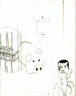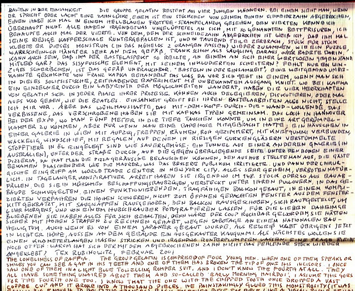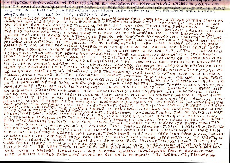 THE LONELINESS OF RAFFIA. THE GROUP GELATIN IS COMPRISED OF FOUR YOUNG MEN. WHEN ONE OF THEM SPEAKS OR SMILES YOU CAN SEE A GAP IN HIS TEETH AND ONE OF THEM HAS BROKEN THE TIP OF ONE HIS INCISORS. I ONCE SAW ONE OF THEM IN A LIGHT BLUE TOWELLING ROMPER SUIT, AND I DON'T KNOW THE FOURTH AT ALL. THEY ALL HAVE SOMETHING UNAIRED ABOUT THEM AND SO-CALLED 'EARLY MORNING HAIRDOS! I ASSUME THIS GOES FOR THE FOURTH ONE TOO. I KNOW THAT THE ONE WITH THE CHIPPED TOOTH ONCE DROPPED A VAST COFFEE CUP AND IT BROKE INTO A THOUSAND PIECES. HE PAINSTAKINGLY GLUED THIS MONSTROSITY (IT WAS EASILY BIG ENOUGH TO HOLD TWO ORANGES) BACK TOGETHER, PIECE FOR PIECE LIKE A JIGSAW PUZZLE. HE WAS PROBABLY VERY ATTACHED TO THE VESSEL HAVING DRUNK OUT OF IT WHEN HE WAS A BABY, OR HAVING BEEN BATHED IN IT. MAYBE THE DIY ASPECT GRABBED HIM IN THE CASE OF THAT RATHER WORTHLESS OBJECT. EVEN PITY? THE SISYPHEAN ASPECT OF THE TASK WITH ITS IMPLICIT DOOM TO FAILURE? IF JUST THE TINIEST CHIP IS MISSING THAN IT IS NO GOOD FOR DRINKING OUT OF ANYMORE. "THE LONELINESS OF RAFFIA" IS A LITTLE KNOWN SHORT STORY BY FRANZ KAFKA AND, AS THE TITLE IMPLIES, IT'S ABOUT WHAT GOES ON IN SOMEONE'S MIND WHEN THEY GET IMMERSED IN A KIND OF SOLIPSISM, A TIME-CONSUMING EXPERIMENT WITH UNKNOWN RESULTS. WHILE KAFKA'S NARRATIVE AN INDIVIDUAL WANDERS THROUGH THE LABYRINTH OF POSSIBILITIES ALONE, THE GENTLEMEN OF GELATIN HAVE ONE ANOTHER. THEY CAN DELEGATE, DISCUSS, OR SIMPLY GO TO THE LOO IN EVERY PHASE OF THEIR PROCESSES, LIKE THE BEATLES. LONELINESS IS NOT AN ISSUE THEN IN THEIR PROCESS, OR SO I ASSUME. BUT THE SUBVERSIVE ELEMENT, WANTING TO GO THROUGH THE WALL HEAD FIRST, THEIR RESOLUTENESS, THEIR ECCENTRICITY ARE ALL SHARED WITH THE KAFKA'S FICTIONAL FIGURE. THE HOLE IN HANNOVER AT THE EXPO, WHERE ONE COULD DIVE FIVE METERS DOWN TO ARRIVE AT A KIND OF JUNK ROOM, BUT ONLY IF YOU HAD YOUR SWIMMING TOGS WITH YOU; A LITTLE HOUSE IN A GALLERY IN VIENNA WITH AN ELEVATOR, STAIRS ROOMS -- A ROUGH PIECE OF CARPENTRY HELD TOGETHER WITH PLASTICINE. IT WAS WOBBLY AND CROOKED WITH SHELVES, AND ON THEM WHERE MUTILATED STUFFED ANIMALS THAT HAVE BEEN PICKLED IN OIL IN VAST JARS LIKE SOUR VEGETABLES. A TUNNEL FROM ANOTHER GALLERY (IN AUSTRALIA) RUNNING RIGHT UNDER THE ROAD. UNDERNEATH A PIZZARIA AT THE OTHER SIDE YOU COULD HEAR THE PIZZA NOISES, THE EXTRACTOR HOOP WAS AN EXPONENT. GUESTS WERE GIVEN BOTTLES OF BEER LIKE BRICKLAYERS, WHICH IRRITATED THE SMARTER PEOPLE IN THE CROWD. AND THEN THE SURGICAL INTERVENTION IN THE WORLD TRADE CENTER IN NEW YORK CITY. EVERYTHING TOP SECRET AND ILLEGAL OF COURSE. IN DAYS HAD TEDIOUSLY SMUGGLED INTO THE BUILDING UNDER THEIR PULLOVERS, THEY CONSTRUCTED A FUNCTIONING LOAD BEARING BALCONY. IN A LONG COMPLICATED PROCESS THEY SCRATCHED PUTTY FROM THE TALL HEAVY WINDOW, WHICH COULDN'T BE OPENED, THEN THEY EXTRACTED IT. USING SUCTION PADS, SHUNTED THE BALCONY OUT, POSED ON IT AT 6 IN THE MORNING AND HAD THEMSELVES PHOTOGRAPHED THERE FROM A HELICOPTER FOR THEIR NEAREST AND DEAREST BACK HOME. THEY KEPT VERY MUM ABOUT IT ALL, BECAUSE IF WORD HAD CREPT OUT ABOUT THEIR COUP THEY COULD HAVE BEEN FINED VERY HEAVILY FOR SABOTAGING A NATIONAL TREASURE EVEN IF IT WAS BUILT BY A JAPANESE. INCIDENTALLY AS PROOF THAT THEY WERE THERE THERE IS NOW A PIECE OF OLD CHEWING GUM STUCK TO THE OUTSIDE OF THE BUILDING AT A DIZZY HIGHT. THE NEXT THING THAT THEY ARE PLANNING IS TO KNIT A KILOMETRE LONG HARP AND HAVE IT DROPPED SOMEWHERE. ONE QUESTION REMAINS UNANSWERED THOUGH WHY DIDN'T THE ONE WITH THE CHIPPED TOOTH GLUE THE MISSING BIT BACK ON AGAIN? TEX RUBINOWITZ, FEBRUARY 2001.