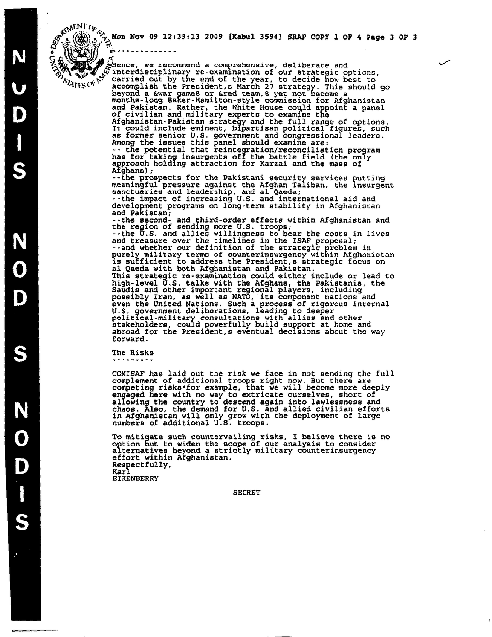 This strategic re-examination could either include or lead to high-level U.S. talks with the Afghans, the Pakistanis, the Saudis and other important regional players, including possibly Iran, as well as NATO, its component nations and even the United Nations. Such a process of rigorous internal U.S. government deliberations, leading to deeper political-military consultations with allies and other stakeholders, could powerfully build support at home and abroad for the President's eventual decisions about the way forward. The Risks COMISAF has laid out the risk we face in not sending the full complement of additional troops right now. But there are competing risks, for example, that we will become more deeply engaged here with no way to extricate ourselves, short of allowing the country to descend again into lawlessness and chaos. Also, the demand for U.S. and allied civilian efforts in Afghanistan will only grow with the deployment of large numbers of additional U.S. troops. To mitigate such countervailing risks, I believe there is no option but to widen the scope of our analysis to consider alternatives beyond a strictly military counterinsurgency effort within Afghanistan. Respectfully, Karl |
