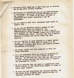 “We need to understand your plans regarding a new [Palestinian Authority] government,” Walles’s script said. “You told Secretary Rice you would be prepared to move ahead within two to four weeks of your meeting. We believe that the time has come for you to move forward quickly and decisively.”