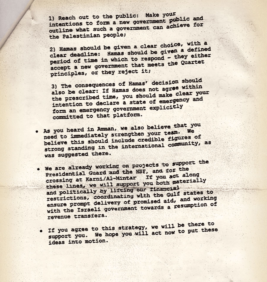 The memo left no doubt as to what kind of action the U.S. was seeking: “Hamas should be given a clear choice, with a clear deadline: … they either accept a new government that meets the Quartet principles, or they reject it. The consequences of Hamas’ decision should also be clear: If Hamas does not agree within the prescribed time, you should make clear your intention to declare a state of emergency and form an emergency government explicitly committed to that platform.”
