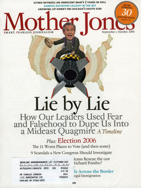 Another View on September 11 Chronicle of a War Foretold -- Truth Was a Casualty Long Before We Invaded Iraq At a June Congressional hearing examining the march to war in Iraq, Republican congressman Walter Jones posed "a very simple question" about the administration's manipulation of intelligence: "How could the professionals see what was happening and nobody speak out?" Colonel Lawrence Wilkerson, Colin Powell's former chief of staff, a man who has dedicated his civilian life to speaking truth to the Bush administration, responded with an equally simple answer: "The vice president." It is easy to pass judgment on Dick Cheney, for there is no longer any reasonable doubt that the vice president willfully distorted the threat posed by Saddam Hussein's Iraq while abusing the power of his office to suppress countervailing information. The administration's dead certainty about the righteousness of "regime change" was like a cancer: Al Qaeda and Saddam were in league -- they just had to be. So detainees would be tortured. And torture would breed false confessions -- of collaboration and chemical weapons training -- providing essential lies that girded the case for a preordained war. But the blame for Iraq does not end wtih the vice president, President Bush, or even Donald Rumsfeld's Pentagon. Nor is it limited to the intelligence operatives who sat silent as the administration cherry-picked its case for war, or to those, like Colin Powell or Hans Blix, who, in the name of loyalty or statesmanship, did not give full throat to their misgivings. It is shared by useful idiots from the Fourth Estate. The New York Times' Judith Miller, to be sure. But also the editors of the Washington Post who routinely relegated vital reporting on the flimsiness of the administration's Iraq intel to Page A13. Blame also belongs squarely on the shoulders of the 94 U.S. senators who could not be bothered to read the full 92-page National Intelligence Estimate on Iraq -- which contained far more dissenting intelligence than had ever been made public in the national debate -- before voting to send American troops to war. And it lies, inescapably, with we the American people, who, in our fear and rage over the catastrophic events of September 1, 2001, alowed ourselves to be suckered into the most audacious bait and switch of al time. Half a trillion dollars later, Saddam may be in jail, but Osama's still at large, Iraq looks ever more like Afghanistan -- where the Taliban is again resurgent - and nearly 60,000 Americans and Iraqis are dead. How did it happen? This timeline is, in part, an effort to answer that question. It draws upon the first drafts of history: the essential news reporting of America's finest journalists. Some, like the Post's Walter Pincus and Dana Priest, were bold enough to buck the administration's master narrative; others -- including the mythic Bob Woodward -- compromised their journalistic integrity for access but nonetheless captured details that only access could provide. It is complemented by the work of foreigners: the British reporter Michael Smith, for instance, who unearthed the so-called Downing Street memos. And it is rounded out by tales of whistleblowers and administration turncoats -- by the firsthand accounts of former Treasury Secretary Paul O'Neill, ex-counterterror czar Richard Clarke, and, yes, Colonel Wilkerson. The first drafts of history are, by their nature, fragmentary. They arrive tragically late, and too often out of order. Here, then, we have stripped the history of the five bloody years since 9/11 to its bare bones, and reconstructed a skeleton that we hope will be a key to resolving open questions of the Bush era. What did our leaders know, and when did they know it? And, perhaps just as important, what red flags did we miss, and how could we have missed them? The eight pages we present here are a small fraction of this project. Our website, MotherJones.com, offers a greatly expanded timeline, one that is completely sourced to primary documents and initial news accounts; one that is interactive, sortable, and continues to the present day. It is our hope to make this second draft of history as definitive as possible. So that we won't be fooled again. --THE EDITORS 8/14/92 -- Defense Sec. Dick Cheney declares President Bush Sr. wise not to invade Baghdad and "get bogged down in the problems of trying to take over and govern Iraq." 4/15/93 -- Saddam Hussein reportedly tries to assassinate Bush Sr. 1/26/98 -- Project for a New American Century (PNAC) -- founded by Cheney, Scooter Libby, Donald Rumsfeld, Jeb Bush, Paul Wolfowitz, and other top neocons -- demands President Clinton undertake the "removal of Saddam Hussein's regime." 6/23/98: "The good Lord didn't see fit to put oil and gas only where there are democratically elected regimes friendly to the United States." -- Halliburton CEO Cheney 8/7/98 -- Al Qaeda bombs U.S. embassies in Africa, killing 220 and injuring some 4,000. 10/31/98 -- Clinton signs the Iraq Liberation Act. Regime change becomes official U.S. policy. Late 1998 -- Gen. Anthony Zinni, head of U.S. Central Command, examines Iraqi exile Ahmed Chalabi's military plan to overthrow Saddam with 1,000 men. He warns Congress it is "pie in the sky, a fairy tale." Nov. 1999 -- Chalabi-connected Iraqi defector "Curveball" -- a convicted sex offender and low-level engineer who became the sole source for much of the case that Saddam had WMD, particularly mobile weapons labs -- enters Munich seeking a German visa. German intel officers describe his information as highly suspect. U.S. agents never debrief Curve-ball or perform background check. Nonetheless, Defense Intelligence Agency (DIA) and CIA will pass raw intel on to senior policymakers. 8/27/00 -- America must not act as "an imperialist power, willy-nilly moving into capitals in that part of the world, taking down governments." -- VP candidate Cheney 10/3/00 -- Debating Al Gore, George W. Bush says he'd 