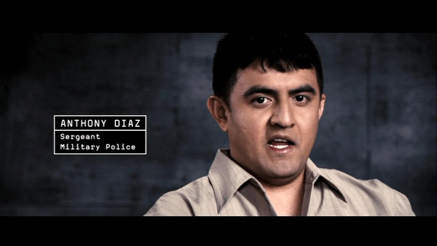 1 oga in 1B Shower not to be used until OGA is moved out 1A 34/5 04 Nov 2003 [ANTHONY DIAZ, SERGEANT MILITARY POLICE] It was early in the morning, like 4:30, around that time, so everything was silent. OGAs were, "Okay, we have another special prisoner here." He was wearing only a shirt. So he came in, he was shackled, handcuffed and everything, with a hood on. When he came in, we didn't ask nobody who this guy was, what he did. That wasn't our business. Two soldiers took him straight to the shower where he was interrogated by one OGA. He was there quite a while, I think he was there about an hour and a half. All of a sudden the OGA guy opened the door and said, "Can you help me here? Tie him a little higher, because he don't want to cooperate." Now, he's, I guess, you know he was just sagging. [JEFFREY FROST, SPECIALIST MILITARY POLICE] There were some CIA guys there, or I think they are CIA, well, yeah, they were, but at the time we didn't know what Agency they were with. They asked us to handcuff him to the window so he has to hold himself up 'cause he was playing Possum. And I'm just holding him by the jumpsuit. I'm not holding him under the arms or anything. And his jumpsuit is riding up his crotch and I commented and said, "Damn, this guy's pretty good at playing Possum 'cause I know I'd be howling like whatever with this riding up my crotch like his jumpsuit was." Everybody just kind of laughed and nobody really thought anything of it, and I remember how far back his arms were going, and it was just really an awkward position, and I again was like, "You know, this guy is pretty damn good 'cause his arms are almost about to break and I'm surprised they haven't broken. I'm waiting for the pop." And then all of a sudden, just like, I guess blood started pouring out of his nose and mouth, so we realized that something was wrong. [ANTHONY DIAZ, SERGEANT MILITARY POLICE] That's when I went and raised the hood. And that's the first time I saw his face. I was surprised because his face was totally messed up. He's got a huge black eyes with bruises everywhere. And it was like, "Whoa! What happened to this guy?" And one of his eye was open, so I kind of did the thing like here so he could move his eyes, and nothing, he was just looking down like this. And I was like, "Whoa! This guy is not even alive."